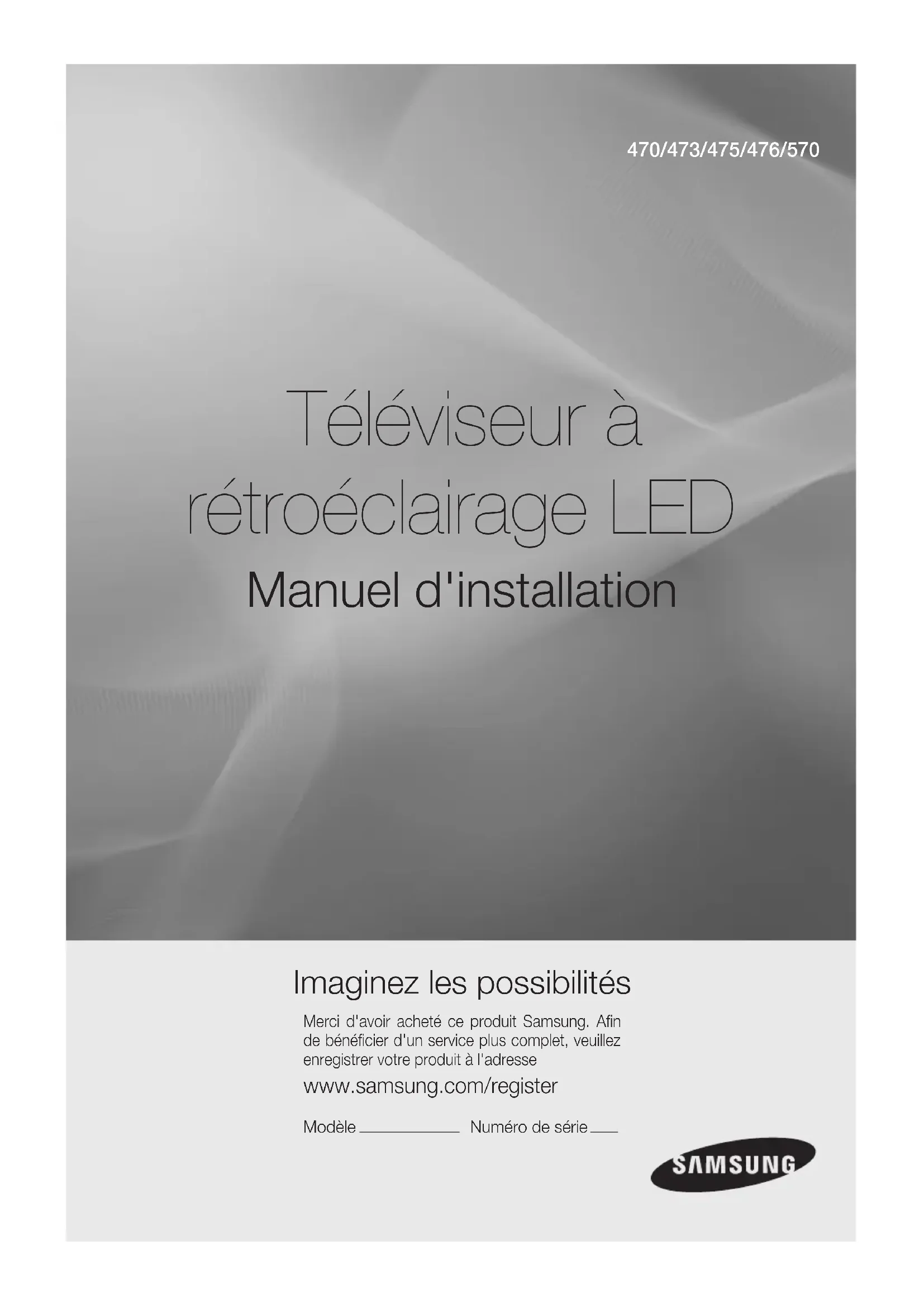 Téléviseur à rétroéclairage LED Manuel d'installation Imaginez les possibilités Merci d'avoir acheté ce produit Samsung. Afin de bénéficier d'un service plus complet, veuillez enregistrer votre produit à l'adresse www.samsung.com/register Modèle Numéro de série 470/473/475/476/570Les figures et illustrations contenues dans ce mode d'emploi sont fournies pour référence uniquement. Elles peuvent différer de l'aspect réel du produit. La conception et les spécifications du produit sont susceptibles d'être modifiées sans préavis. Instructions Ce téléviseur propose des fonctionnalités interactives via un boîtier set-back box (SBB/STB) connecté au téléviseur et d'autres téléviseurs sur un système contrôlé par ordinateur pour les hôtels et autres lieux d'accueil. Interactif: à sa première mise sous tension, le téléviseur envoie une commande pour identifier le SBB/STB. En cas d'identification, il passe en mode EN LIGNE et le contrôle passe entièrement par le SBB/STB. En mode EN LIGNE, le téléviseur ne reçoit plus les commandes infrarouges (Samsung Remote) et fonctionne selon le protocole d'interface. Autonome: si le SBB/STB n'est pas identifié, le téléviseur passe en mode AUTONOME avec un fonctionnement restreint. Modes de fonctionnement Si ce téléviseur (en mode Hotel) fonctionne avec un SBB/STB, il s'agit d'un des deux états suivants: