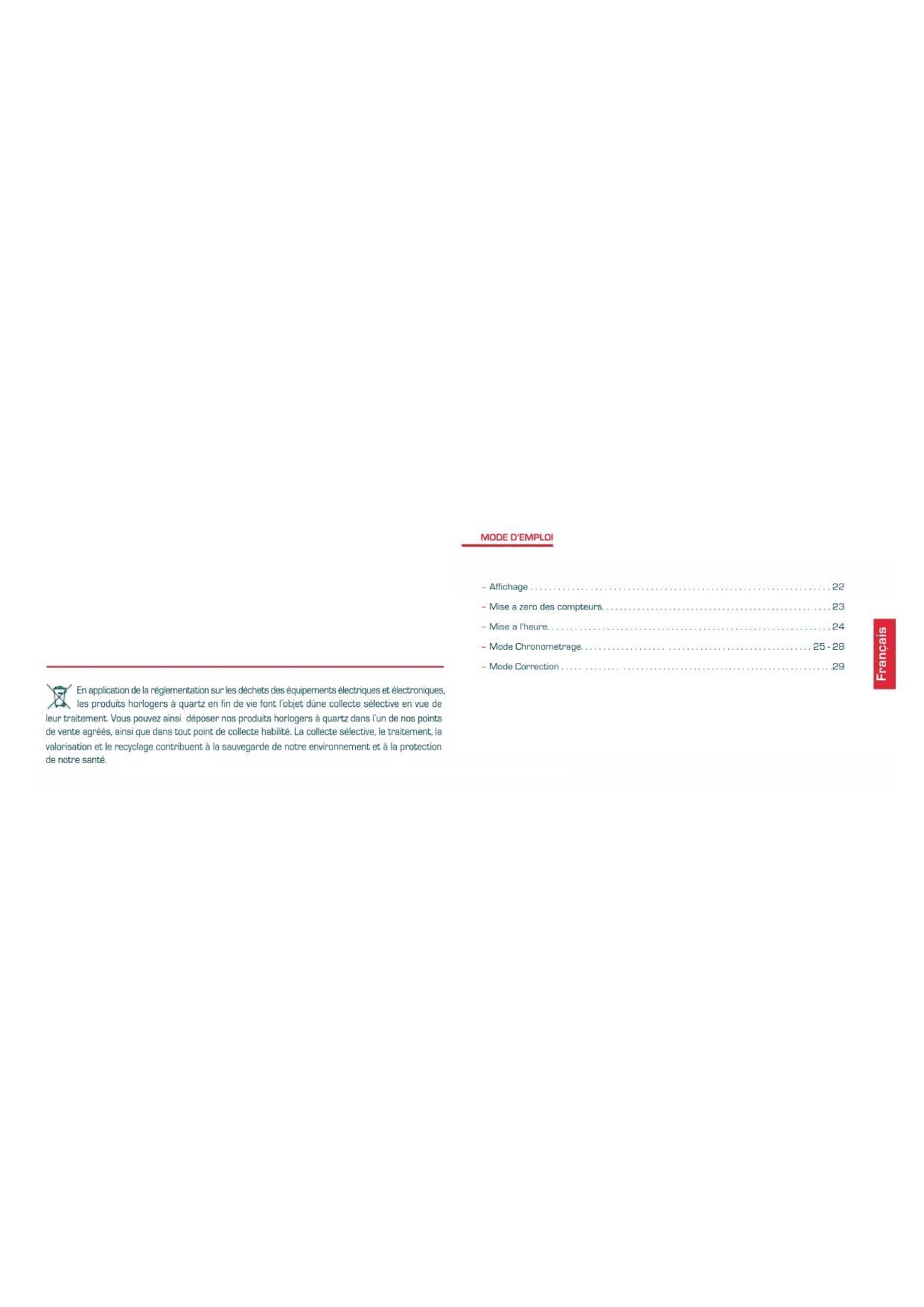 En application de la réglementation sur les déchets des équipements électriques et électroniques, les produits horlogers à quartz en fin de vie font l'objet dune collecte sélective en vue de leur traitement. Vous pouvez ainsi déposer nos produits horlogers à quartz dans l'un de nos points de vente agrées, ainsi que dans tout point de collecteabilité. La collecte sélective, le traitement, la valorisation et le recyclage contribuant à la sauvégarde de notre environnement et à la protection de notre santé.