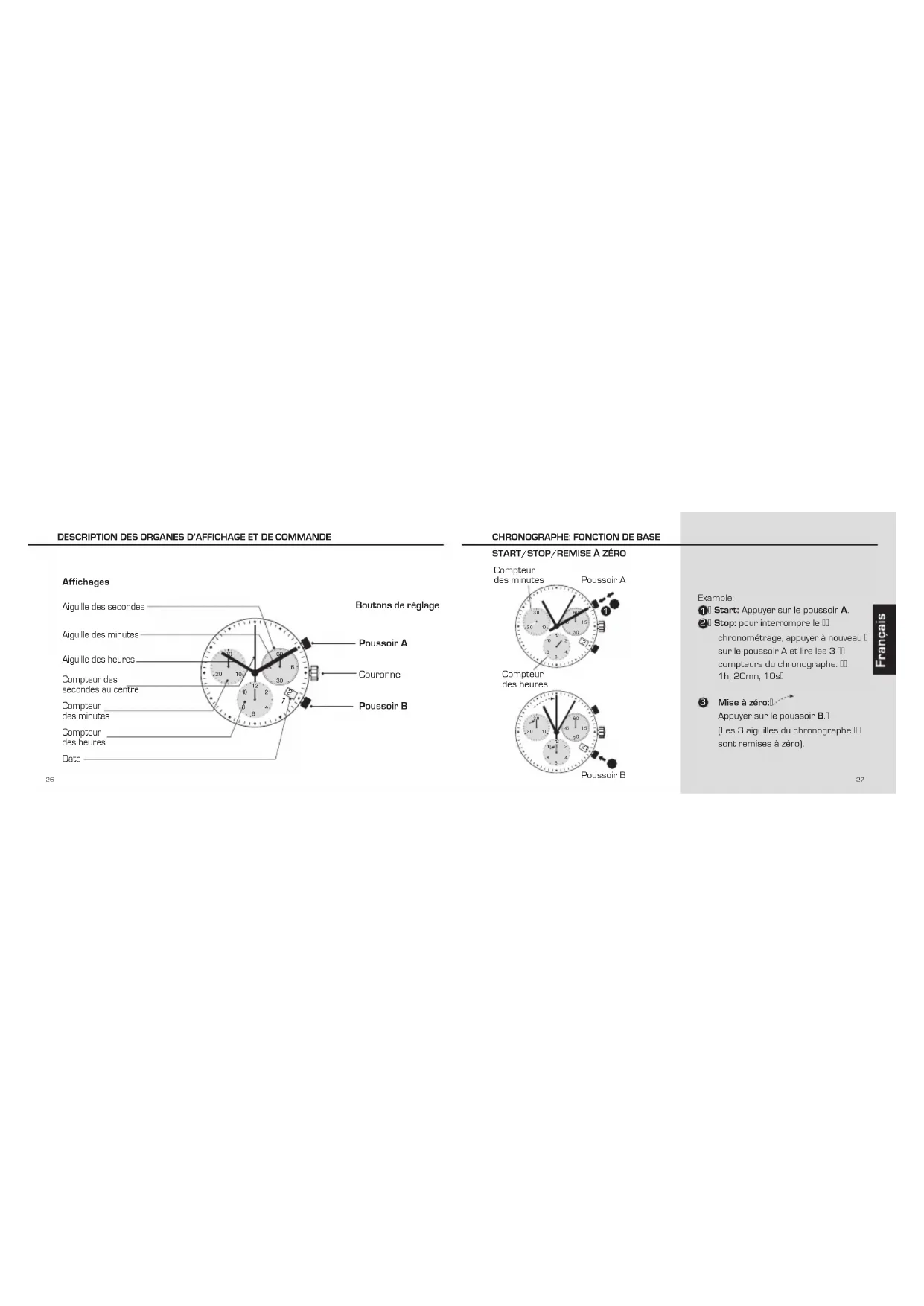 Example: Start: Appuyer sur le poussoir A. Stop: pour interrompre le chronométrage, appuyer à nouveau sur le poussoir A et lire les 3 compteurs du chronographe: 1h, 20mn, 10s Mise à zéro: Appuyer sur le poussoir B. (Les 3 aiguilles du chronographe sont remises à zéro).