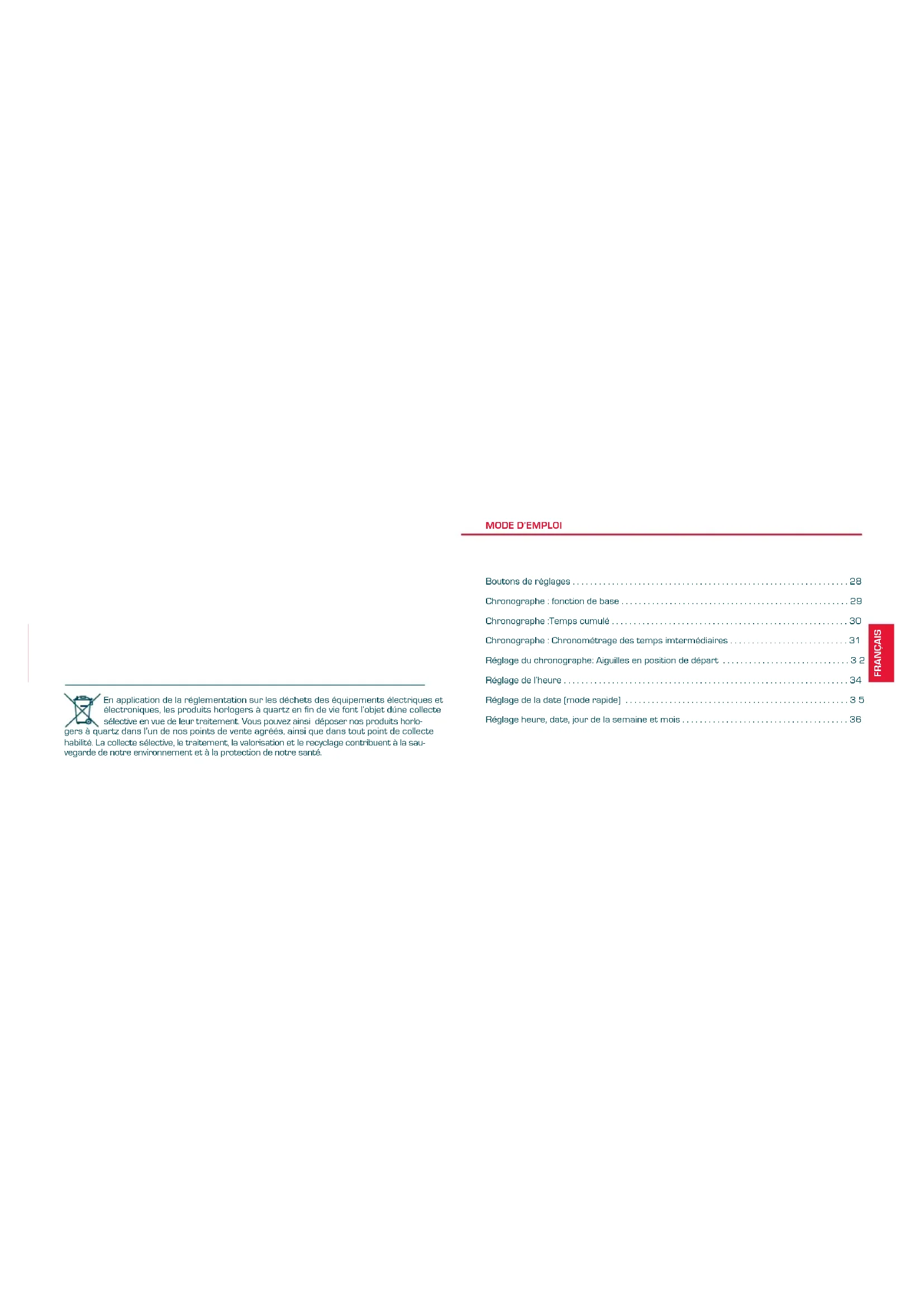 En application de la réglementation sur les déchets des équipements électriques et électroniques, les produits horlogers à quartz en fin de vie font l'objet d'une collecte sélective en vue de leur traitement. Vous pouvez ainsi déposer nos produits horlo-