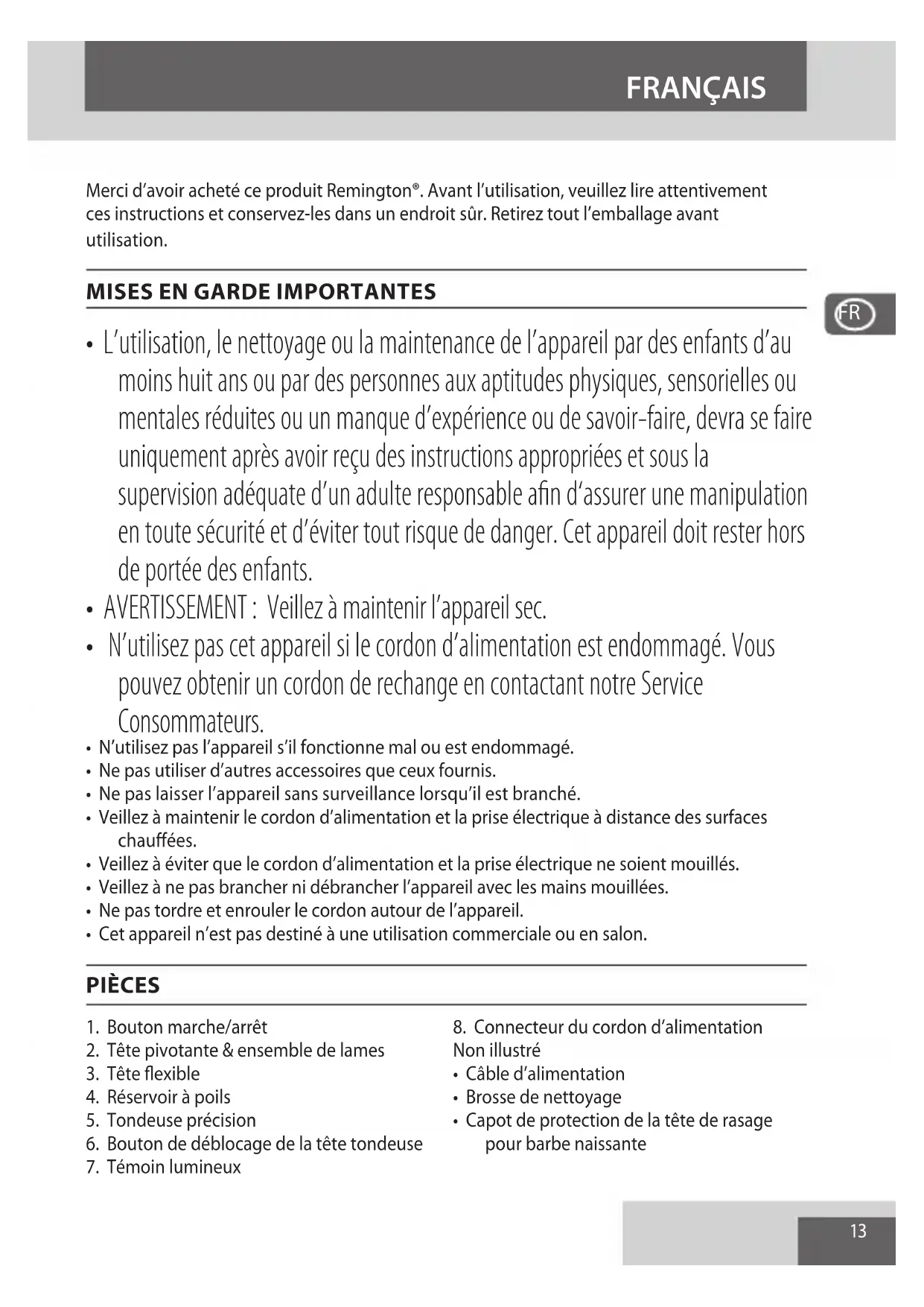An d’éviter les problèmes occasionnés à l’environnement et à la santé par des substances dangereuses, les appareils et les batteries rechargeables et non rechargeables présentant l’un de ces symboles ne doivent pas être éliminés avec les déchets municipaux non triés. Éliminez dans tous les cas les produits électriques et électroniques et, le cas échéant, les batteries rechargeables et non rechargeables, dans un centre ociel et approprié de collecte/recyclage.16 Gracias por comprar nuestro nuevo producto Remington®. Lea detenidamente las instrucciones y guárdelas en un lugar seguro. Retire todo el embalaje antes de usar el producto.