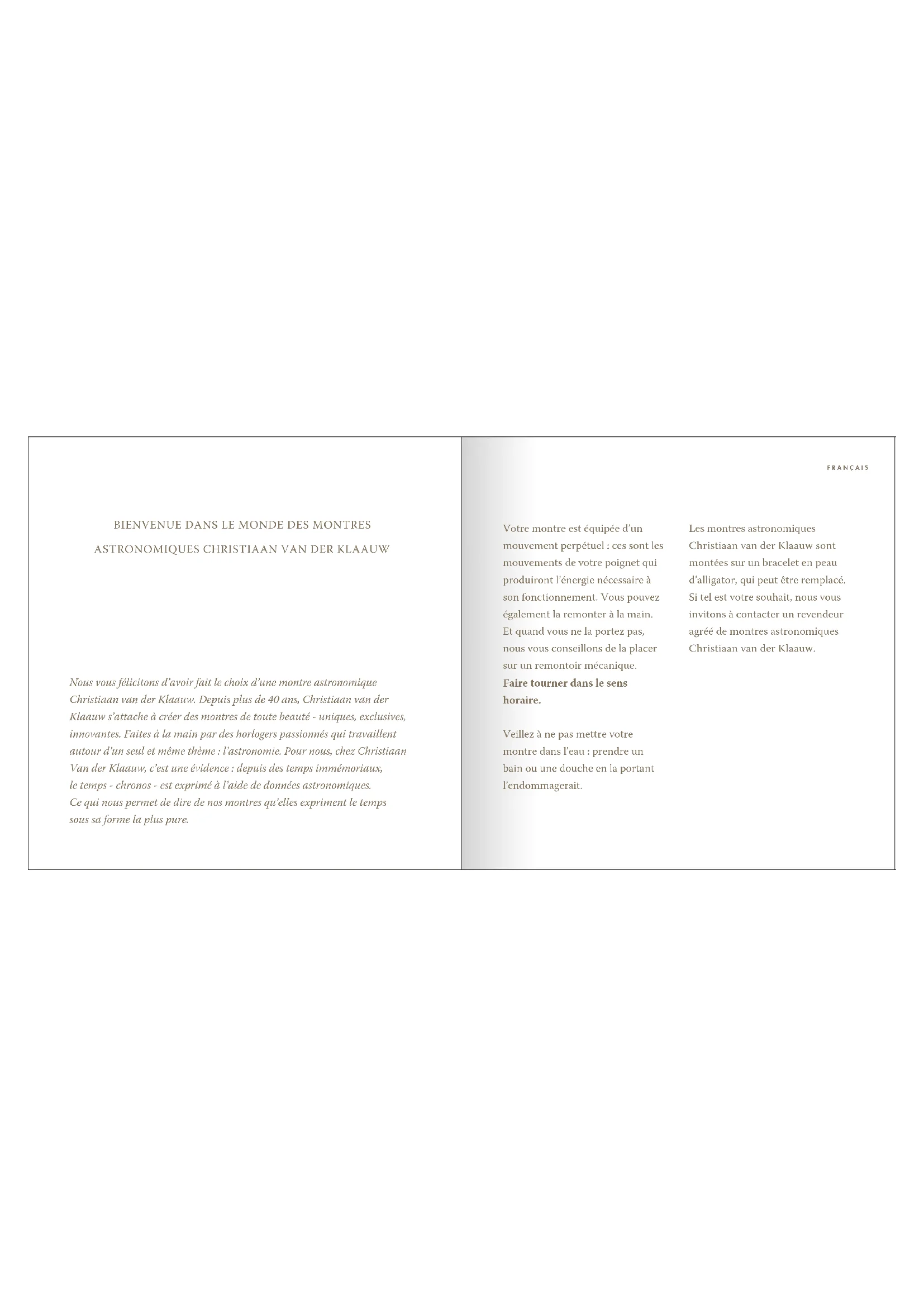 Op de ‘6-uurpositie’ worden de maanfasen weergegeven. Wanneer de Maan links van het midden staat bevindt de Maan zich in het eerste kwartier. Wanneer de beeltenis in het midden staat is het volle Maan en aan de rechterkant bevindt de Maan zich in het laatste kwartier. Indien de Maan niet zichtbaar is, is het nieuwe Maan. NEDERLANDSNEDERLANDSNous vous félicitons d’avoir fait le choix d’une montre astronomique Christiaan van der Klaauw. Depuis plus de 40 ans, Christiaan van der Klaauw s’attache à créer des montres de toute beauté - uniques, exclusives, innovantes. Faites à la main par des horlogers passionnés qui travaillent autour d’un seul et même thème : l’astronomie. Pour nous, chez Christiaan Van der Klaauw, c’est une évidence : depuis des temps immémoriaux, le temps - chronos - est exprimé à l’aide de données astronomiques. Ce qui nous permet de dire de nos montres qu’elles expriment le temps sous sa forme la plus pure. Votre montre est équipée d’un mouvement perpétuel : ces sont les mouvements de votre poignet qui produiront l’énergie nécessaire à son fonctionnement. Vous pouvez également la remonter à la main. Et quand vous ne la portez pas, nous vous conseillons de la placer sur un remontoir mécanique. Faire tourner dans le sens horaire. Veillez à ne pas mettre votre montre dans l’eau : prendre un bain ou une douche en la portant l’endommagerait. Les montres astronomiques Christiaan van der Klaauw sont montées sur un bracelet en peau d’alligator, qui peut être remplacé. Si tel est votre souhait, nous vous invitons à contacter un revendeur agréé de montres astronomiques Christiaan van der Klaauw. FRANÇAIS