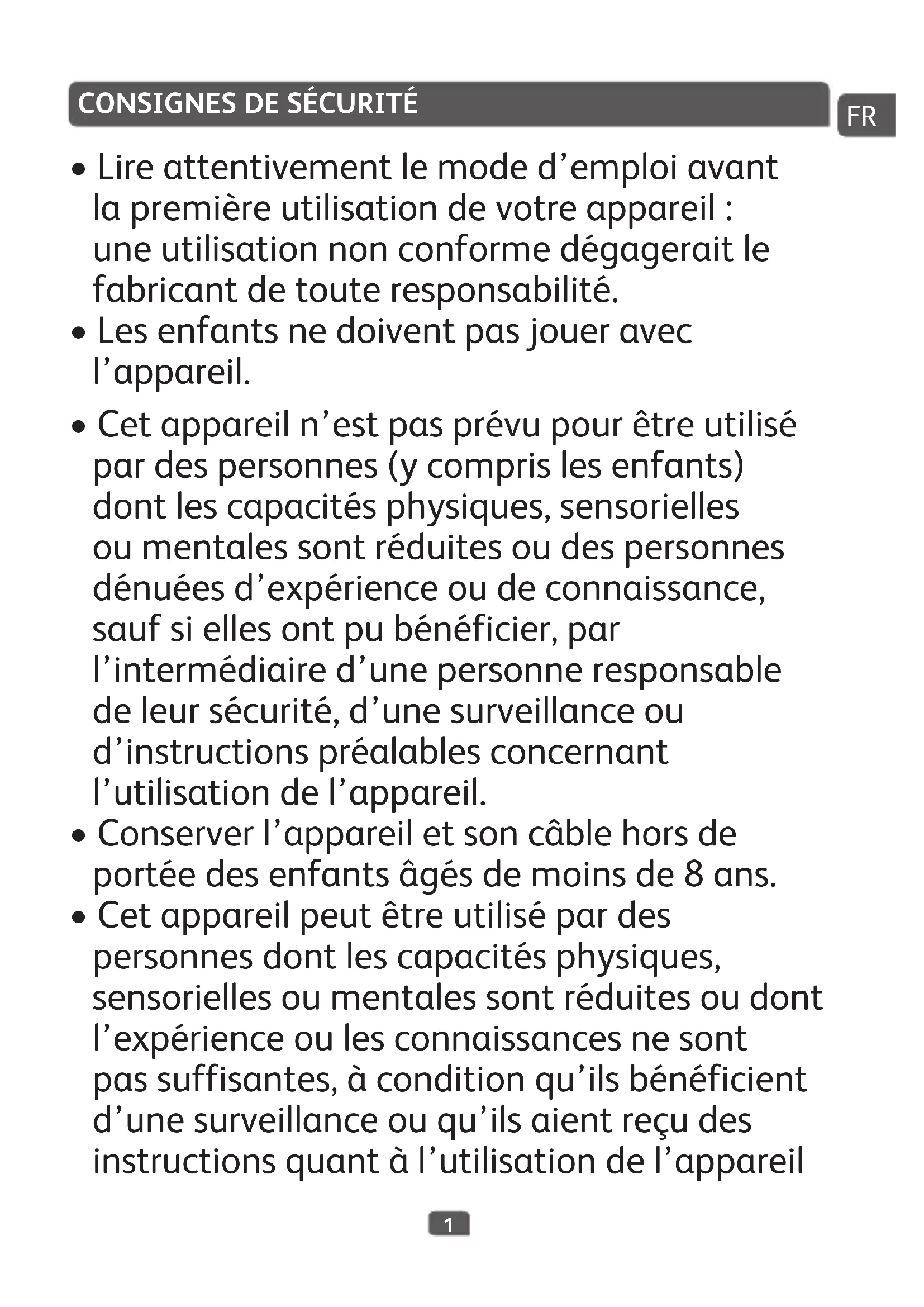 - Cetappareilpeutêtreutilisépardes personnesdontlescapacitésphysiques, sensoriellesoumentalessontréduitesoudont l’expérienceoulesconnaissancesnesont passuffisantes,àconditionqu’ilsbénéficient d’unesurveillanceouqu’ilsaientreçudes instructionsquantàl’utilisationdel’appareil FR2