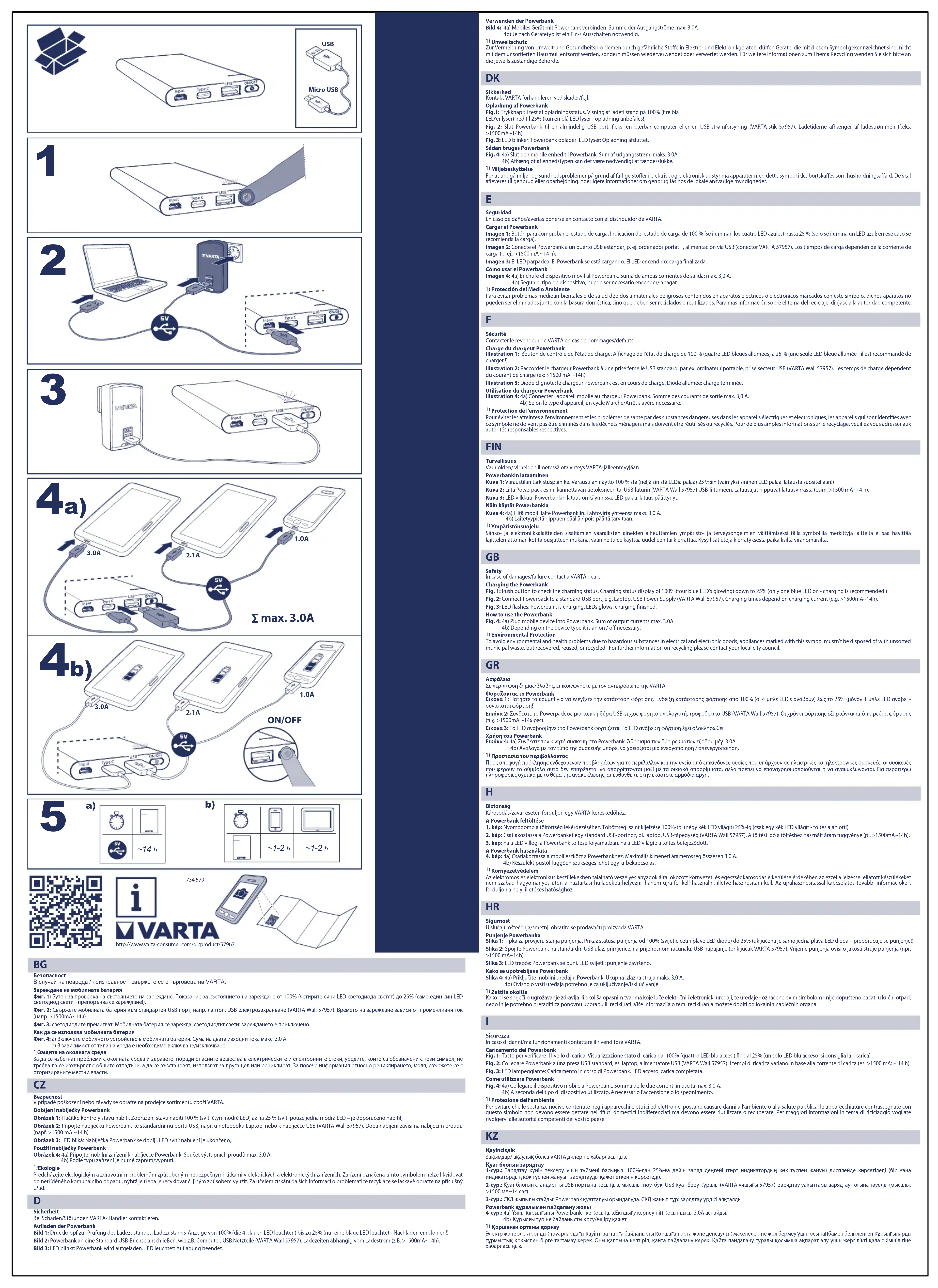 Sécurité Contacter le revendeur de VARTA en cas de dommages/défauts. Charge du chargeur Powerbank Illustration 1: Bouton de contrôle de l'état de charge. Affichage de l'état de charge de 100 % (quatre LED bleues allumées) à 25 % (une seule LED bleue allumée - il est recommandé de charger !) Illustration 2: Raccorder le chargeur Powerbank à une prise femelle USB standard, par ex. ordinateur portable, prise secteur USB (VARTA Wall 57957). Les temps de charge dépendent du courant de charge (ex: >1500 mA ~14h). Illustration 3: Diode clignote: le chargeur Powerbank est en cours de charge. Diode allumée: charge terminée. Utilisation du chargeur Powerbank Illustration 4: 4a) Connecter l'appareil mobile au chargeur Powerbank. Somme des courants de sortie max. 3,0 A. 4b) Selon le type d'appareil, un cycle Marche/Arrêt s'avère nécessaire.