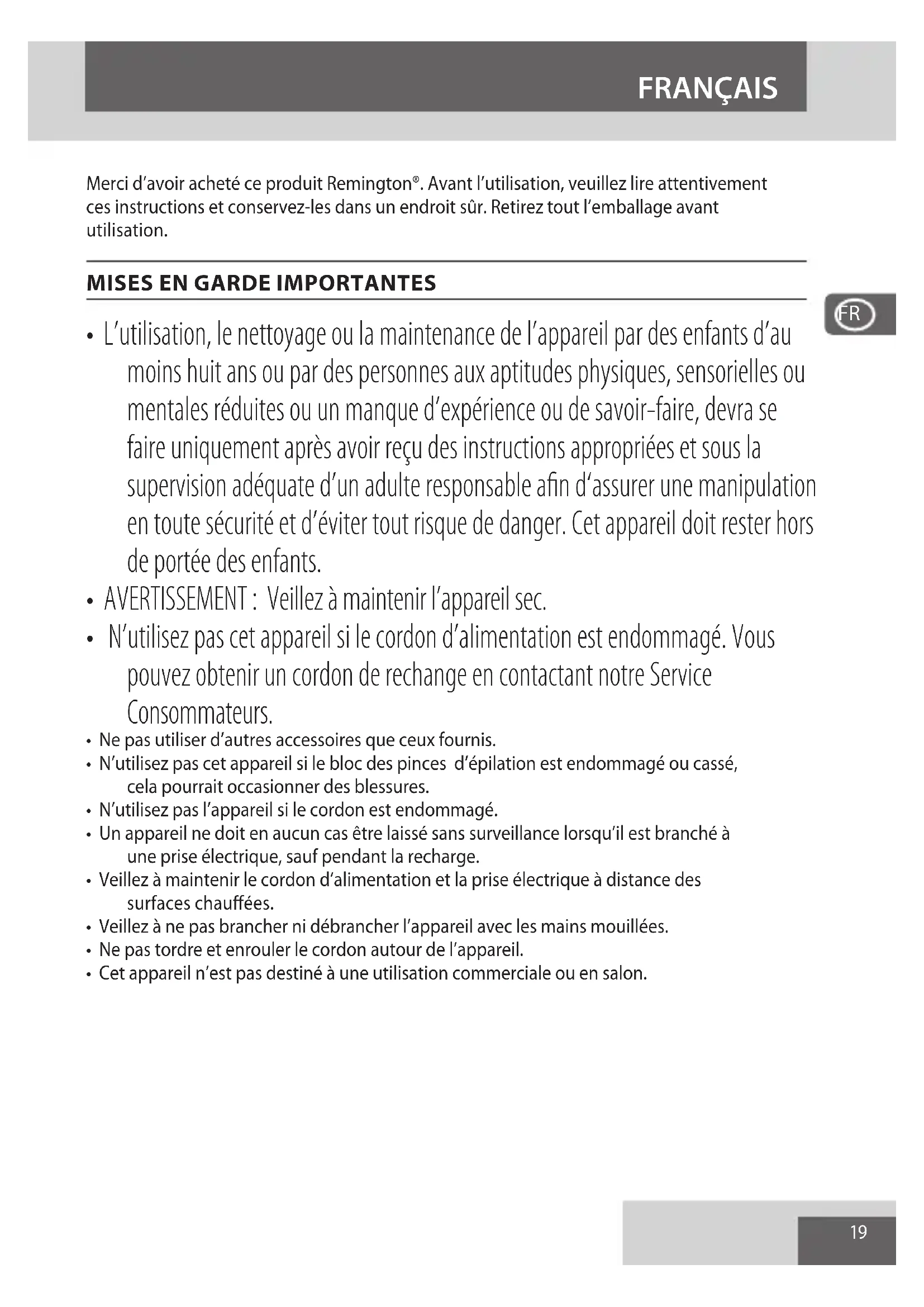 An d’éviter les problèmes occasionnés à l’environnement et à la santé par des substances dangereuses, les appareils et les batteries rechargeables et non rechargeables présentant l’un de ces symboles ne doivent pas être éliminés avec les déchets municipaux non triés. Éliminez dans tous les cas les produits électriques et électroniques et, le cas échéant, les batteries rechargeables et non rechargeables, dans un centre ociel et approprié de collecte/recyclage.25 Gracias por comprar nuestro nuevo producto Remington®. Lea detenidamente las instrucciones y guárdelas en un lugar seguro. Retire todo el embalaje antes de usar el producto.