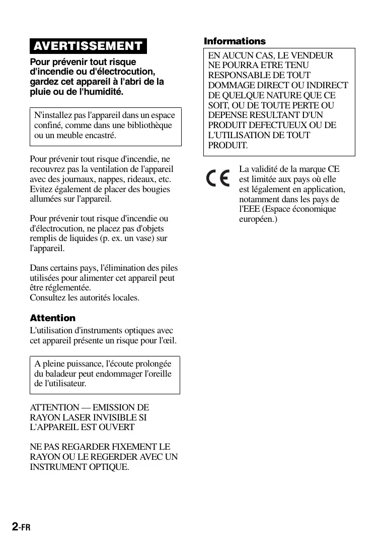 AVERTISSEMENT Pour prévenir tout risque d'incendie ou d'électrocution, gardez cet appareil à l'abri de la pluie ou de l'humidité. N'installez pas l'appareil dans un espace confiné, comme dans une bibliothèque ou un meuble encastré. Pour prévenir tout risque d'incendie, ne recouvrez pas la ventilation de l'appareil avec des journaux, nappes, rideaux, etc. Evitez également de placer des bougies allumées sur l'appareil. Pour prévenir tout risque d'incendie ou d'électrocution, ne placez pas d'objets remplis de liquides (p. ex. un vase) sur l'appareil. Dans certains pays, l'élimination des piles utilisées pour alimenter cet appareil peut être réglementée. Consultez les autorités locales. Attention L'utilisation d'instruments optiques avec cet appareil présente un risque pour l'œil. A pleine puissance, l'écoute prolongée du baladeur peut endommager l'oreille de l'utilisateur. ATTENTION — EMISSION DE RAYON LASER INVISIBLE SI L'APPAREIL EST OUVERT NE PAS REGARDER FIXEMENT LE RAYON OU LE REGERDER AVEC UN INSTRUMENT OPTIQUE.
