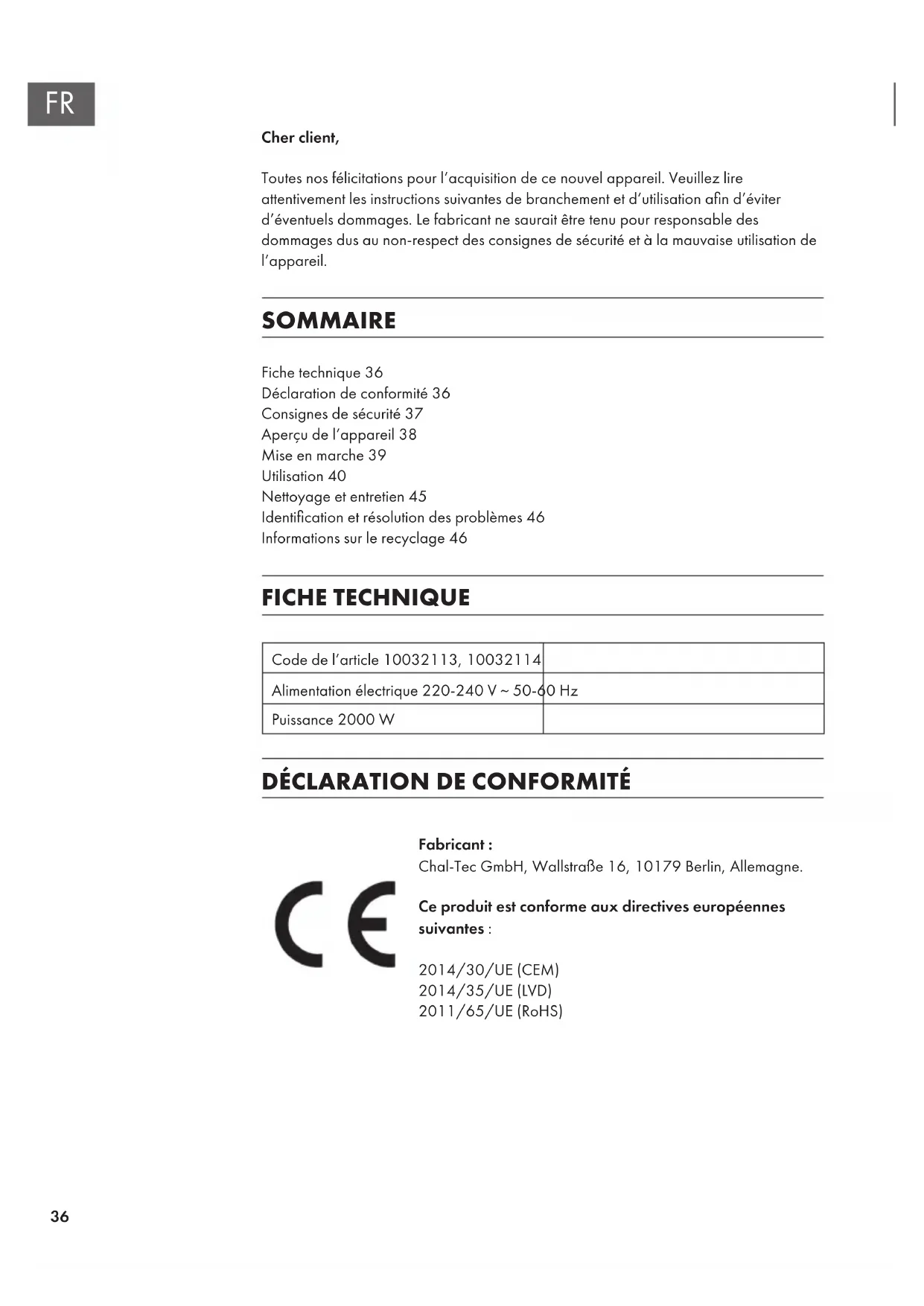 Fabricant : Chal-Tec GmbH, Wallstraße 16, 10179 Berlin, Allemagne. Ce produit est conforme aux directives européennes suivantes : 2014/30/UE (CEM) 2014/35/UE (LVD) 2011/65/UE (RoHS)37
