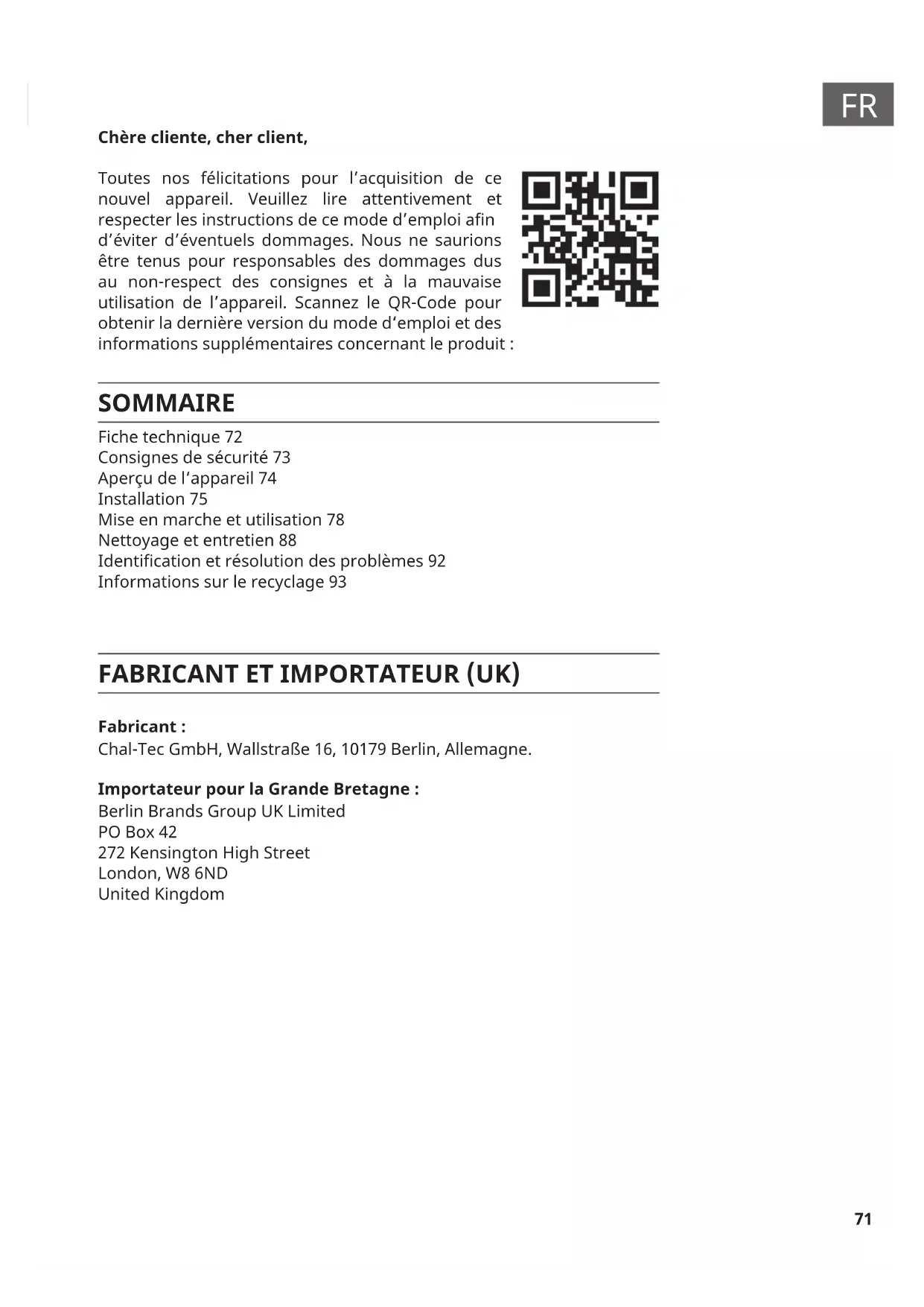 Chère cliente, cher client, Toutes nos félicitations pour l’acquisition de ce nouvel appareil. Veuillez lire attentivement et respecter les instructions de ce mode d’emploi an d’éviter d’éventuels dommages. Nous ne saurions être tenus pour responsables des dommages dus au non-respect des consignes et à la mauvaise utilisation de l’appareil. Scannez le QR-Code pour obtenir la dernière version du mode d‘emploi et des informations supplémentaires concernant le produit : SOMMAIRE FABRICANT ET IMPORTATEUR (UK) Fabricant : Chal-Tec GmbH, Wallstraße 16, 10179 Berlin, Allemagne. Importateur pour la Grande Bretagne : Berlin Brands Group UK Limited PO Box 42 272 Kensington High Street London, W8 6ND United Kingdom Fiche technique 72 Consignes de sécurité 73 Aperçu de l‘appareil 74 Installation 75 Mise en marche et utilisation 78 Nettoyage et entretien 88 Identication et résolution des problèmes 92 Informations sur le recyclage 9372