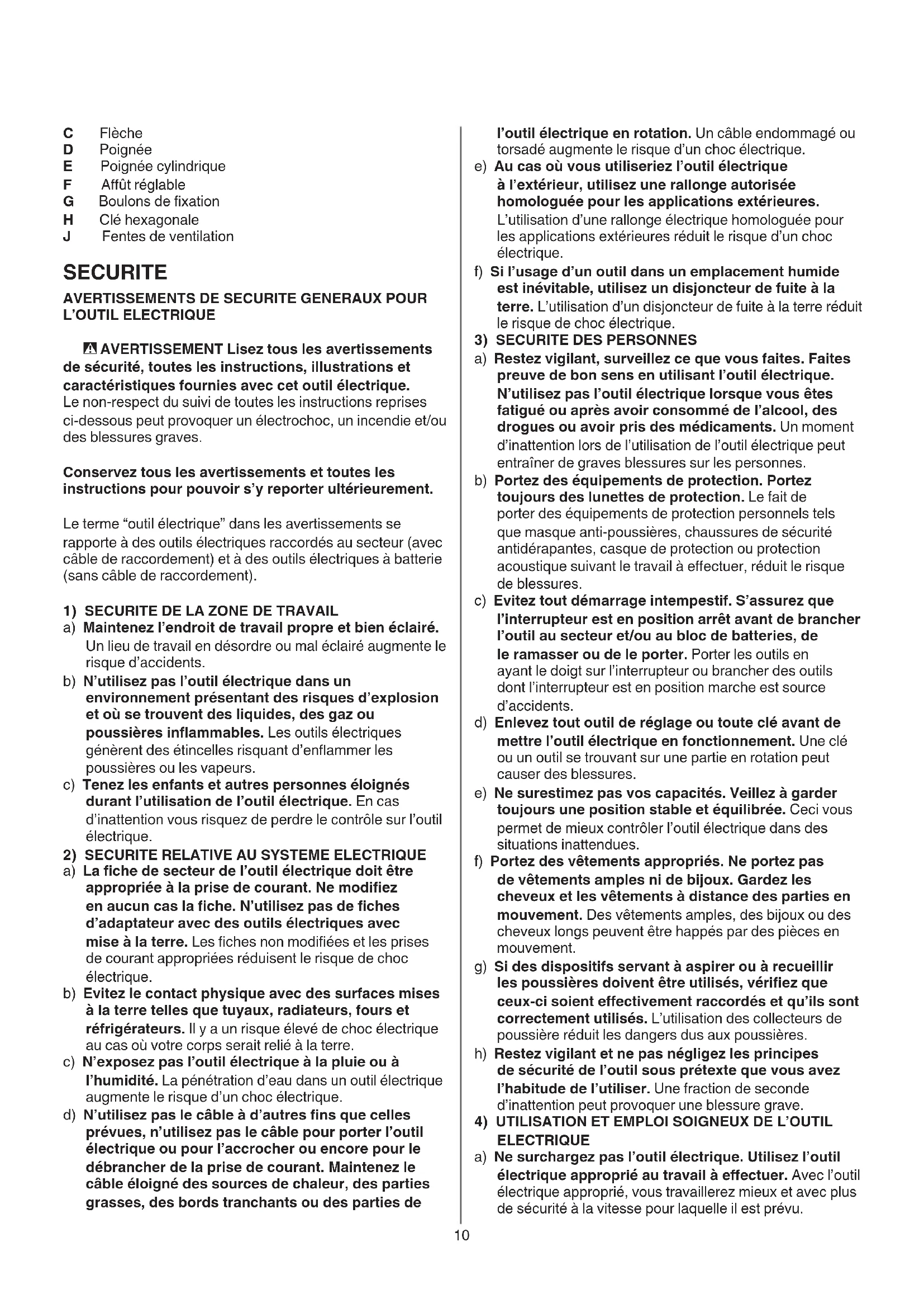 ELECTRIQUE a) Ne surchargez pas l’outil électrique. Utilisez l’outil électrique approprié au travail à eectuer. Avec l’outil électrique approprié, vous travaillerez mieux et avec plus de sécurité à la vitesse pour laquelle il est prévu. C Flèche D Poignée E Poignée cylindrique F Aût réglable G Boulons de xation H Clé hexagonale J Fentes de ventilation SECURITE