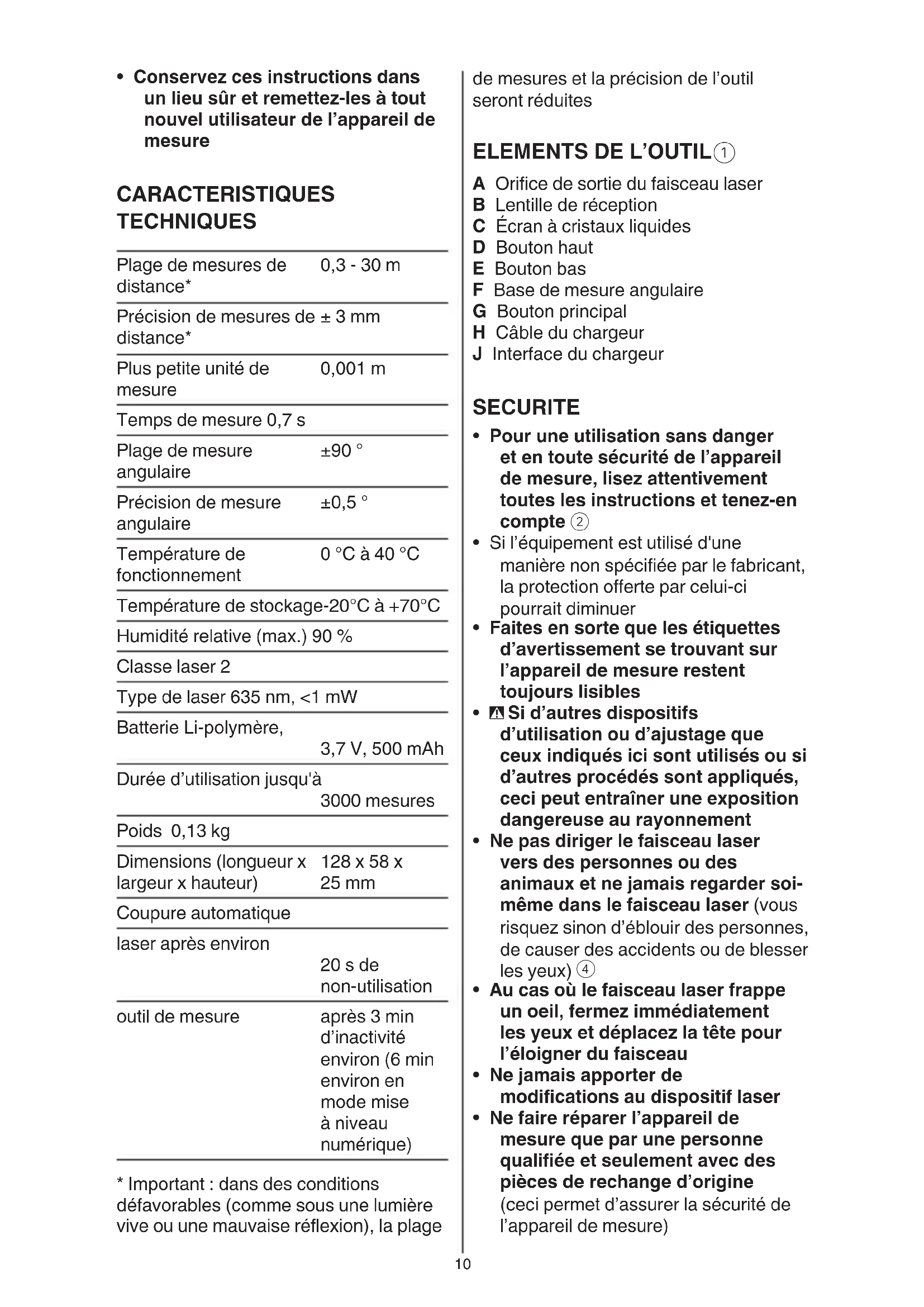 - Conservez ces instructions dans un lieu sûr et remettez-les à tout nouvel utilisateur de l’appareil de mesure CARACTERISTIQUES TECHNIQUES Plage de mesures de distance* 0,3 - 30 m Précision de mesures de distance* ± 3 mm Plus petite unité de mesure 0,001 m Temps de mesure 0,7 s Plage de mesure angulaire ±90 ° Précision de mesure angulaire ±0,5 ° Température de fonctionnement 0 °C à 40 °C Température de stockage-20°C à +70°C Humidité relative (max.) 90 % Classe laser 2 Type de laser 635 nm, <1 mW Batterie Li-polymère, 3,7 V, 500 mAh Durée d’utilisation jusqu'à 3000 mesures Poids 0,13 kg Dimensions (longueur x largeur x hauteur) 128 x 58 x 25 mm Coupure automatique laser après environ 20 s de non-utilisation outil de mesure après 3 min d’inactivité environ (6 min environ en mode mise à niveau numérique)