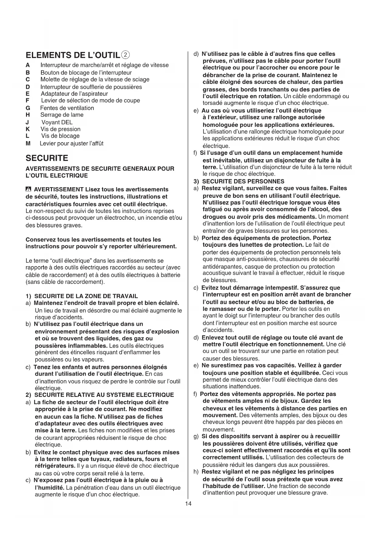 A Interrupteur de marche/arrêt et réglage de vitesse B Bouton de blocage de l’interrupteur C Molette de réglage de la vitesse de sciage D Interrupteur de souerie de poussières E Adaptateur de l’aspirateur F Levier de sélection de mode de coupe G Fentes de ventilation H Serrage de lame J Voyant DEL K Vis de pression L Vis de blocage M Levier pour ajuster l’aût SECURITE