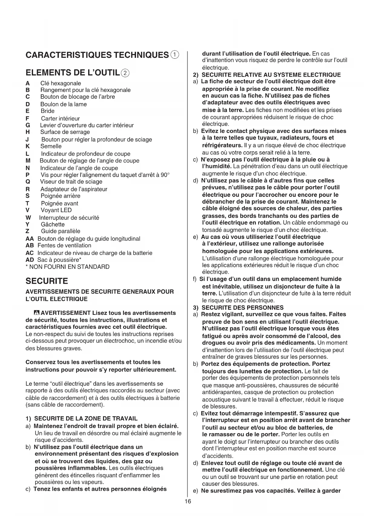 - AVERTISSEMENT Lisez tous les avertissements de sécurité, toutes les instructions, illustrations et caractéristiques fournies avec cet outil électrique. Le non-respect du suivi de toutes les instructions reprises ci-dessous peut provoquer un électrochoc, un incendie et/ou des blessures graves. Conservez tous les avertissements et toutes les instructions pour pouvoir s’y reporter ultérieurement. Le terme “outil électrique” dans les avertissements se rapporte à des outils électriques raccordés au secteur (avec câble de raccordement) et à des outils électriques à batterie (sans câble de raccordement).