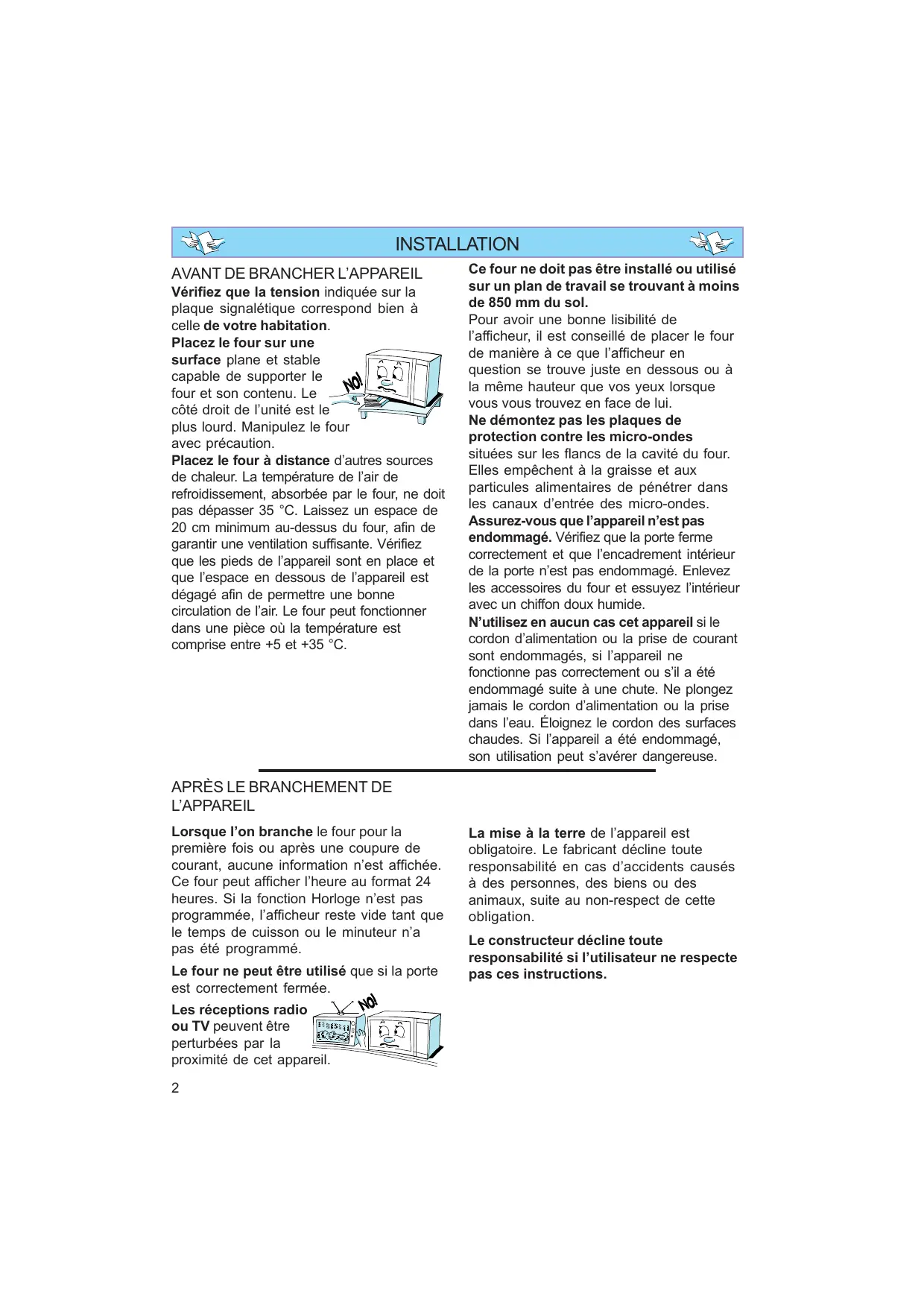 Vérifiez que la tension indiquée sur la plaque signalétique correspond bien à celle de votre habitation. Placez le four sur une surface plane et stable capable de supporter le four et son contenu. Le côté droit de l’unité est le plus lourd. Manipulez le four avec précaution. Placez le four à distance d’autres sources de chaleur. La température de l’air de refroidissement, absorbée par le four, ne doit pas dépasser 35 °C. Laissez un espace de 20 cm minimum au-dessus du four, afin de garantir une ventilation suffisante. Vérifiez que les pieds de l’appareil sont en place et que l’espace en dessous de l’appareil est dégagé afin de permettre une bonne circulation de l’air. Le four peut fonctionner dans une pièce où la température est comprise entre +5 et +35 °C. Ce four ne doit pas être installé ou utilisé sur un plan de travail se trouvant à moins de 850 mm du sol. Pour avoir une bonne lisibilité de l’afficheur, il est conseillé de placer le four de manière à ce que l’afficheur en question se trouve juste en dessous ou à la même hauteur que vos yeux lorsque vous vous trouvez en face de lui. Ne démontez pas les plaques de protection contre les micro-ondes situées sur les flancs de la cavité du four. Elles empêchent à la graisse et aux particules alimentaires de pénétrer dans les canaux d’entrée des micro-ondes. Assurez-vous que l’appareil n’est pas endommagé. Vérifiez que la porte ferme correctement et que l’encadrement intérieur de la porte n’est pas endommagé. Enlevez les accessoires du four et essuyez l’intérieur avec un chiffon doux humide. N’utilisez en aucun cas cet appareil si le cordon d’alimentation ou la prise de courant sont endommagés, si l’appareil ne fonctionne pas correctement ou s’il a été endommagé suite à une chute. Ne plongez jamais le cordon d’alimentation ou la prise dans l’eau. Éloignez le cordon des surfaces chaudes. Si l’appareil a été endommagé, son utilisation peut s’avérer dangereuse.