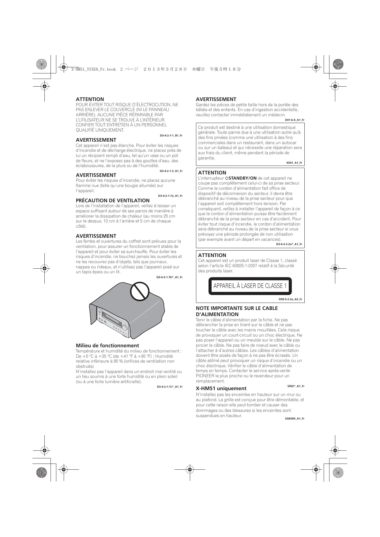 - Un abonnement payant auprès d’un fournisseur d’accès Internet est nécessaire pour utiliser Internet. Nous vous remercions d’avoir acheté ce produit Pioneer. Veuillez lire attentivement ce mode d’emploi afin d’apprendre à manipuler votre modèle correctement. Lorsque vous avez terminé, rangez ces instructions en lieu sûr afin de pouvoir vous y référer à l’avenir. Table des matières 01 Préparatifs Contenu de l’emballage . . . . . . . . . . . . . . . . . . . . . . . . . 5 Mise en place des piles dans la télécommande . . . . . . 5 Utilisation de la télécommande . . . . . . . . . . . . . . . . . . . . 5 02 Les organes et leurs fonctions Télécommande . . . . . . . . . . . . . . . . . . . . . . . . . . . . . . . . Démontage et remontage de la grille avant (X-HM51 uniquement) . . . . . . . . . . . . . . . . . . . . . . . . . . . . . . . . . . Panneau avant . . . . . . . . . . . . . . . . . . . . . . . . . . . . . . . . . Afficheur . . . . . . . . . . . . . . . . . . . . . . . . . . . . . . . . . . . . . .