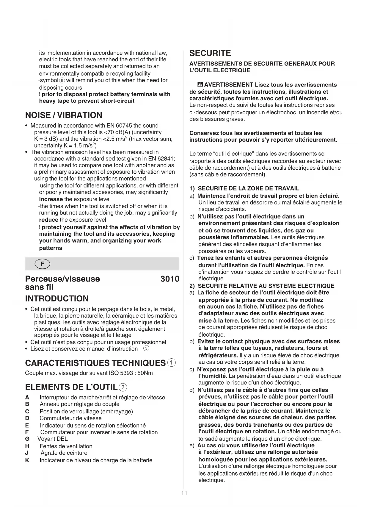 - Mesuré selon EN 60745 le niveau de la pression sonore de cet outil est <70 dB(A) (incertitude K = 3 dB) et la vibration <2,5 m/s² (somme vectorielle des trois axes directionnels; incertitude K = 1,5 m/s²)