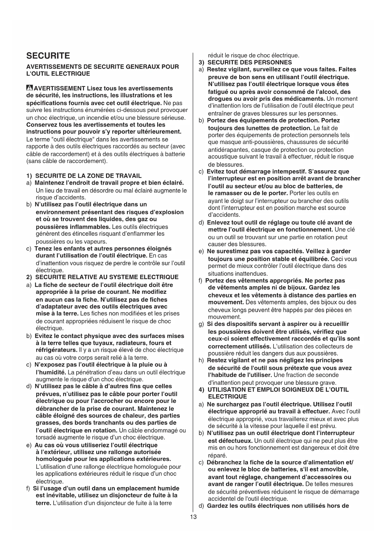 L'OUTIL ELECTRIQUE AVERTISSEMENT Lisez tous les avertissements de sécurité, les instructions, les illustrations et les spécications fournis avec cet outil électrique. Ne pas suivre les instructions énumérées ci-dessous peut provoquer un choc électrique, un incendie et/ou une blessure sérieuse. Conservez tous les avertissements et toutes les instructions pour pouvoir s’y reporter ultérieurement. Le terme "outil électrique" dans les avertissements se rapporte à des outils électriques raccordés au secteur (avec câble de raccordement) et à des outils électriques à batterie (sans câble de raccordement).