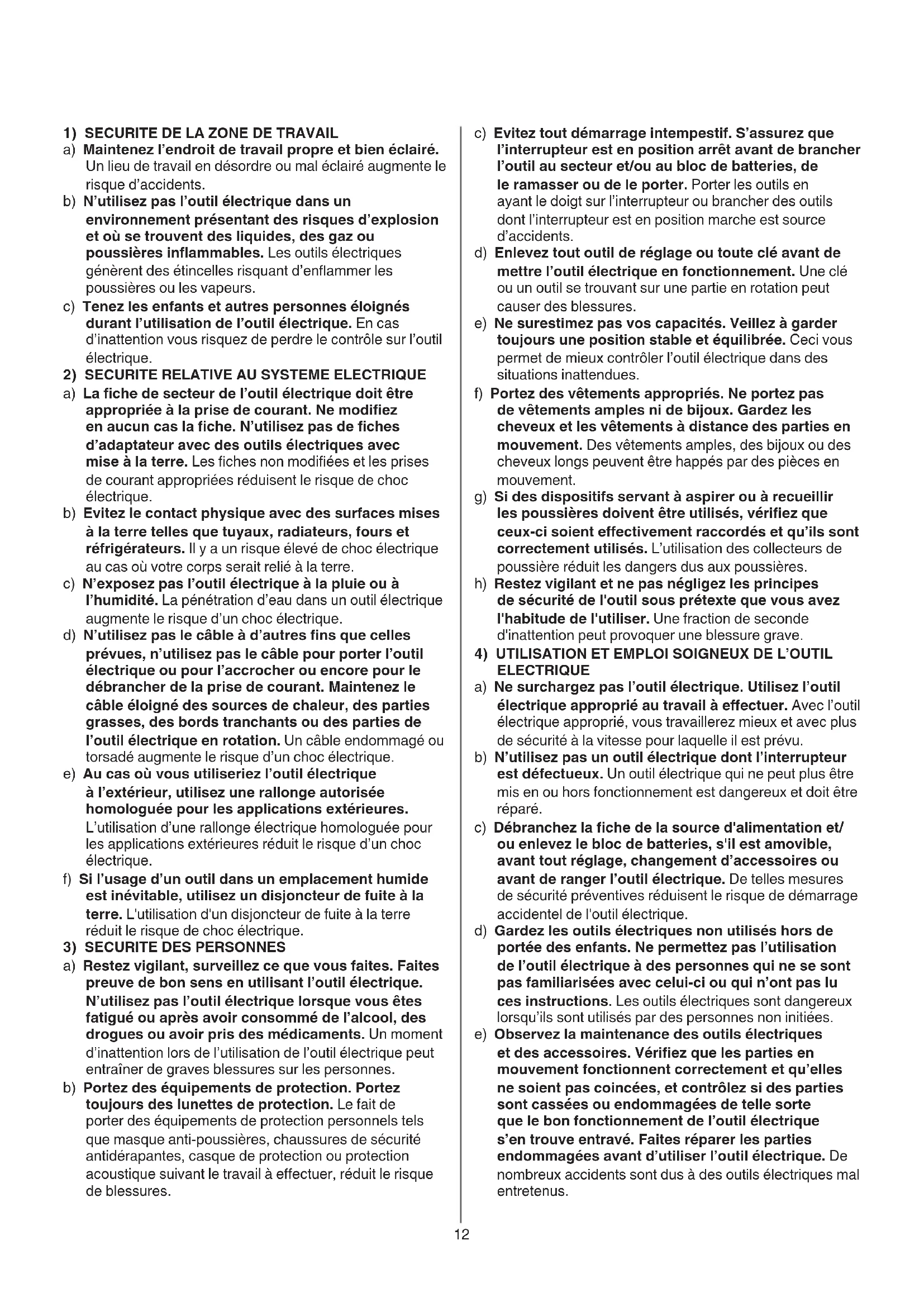 a) Maintenez l’endroit de travail propre et bien éclairé. Un lieu de travail en désordre ou mal éclairé augmente le risque d’accidents. b) N’utilisez pas l’outil électrique dans un environnement présentant des risques d’explosion et où se trouvent des liquides, des gaz ou poussières inammables. Les outils électriques génèrent des étincelles risquant d’enammer les poussières ou les vapeurs. c) Tenez les enfants et autres personnes éloignés durant l’utilisation de l’outil électrique. En cas d’inattention vous risquez de perdre le contrôle sur l’outil électrique.
