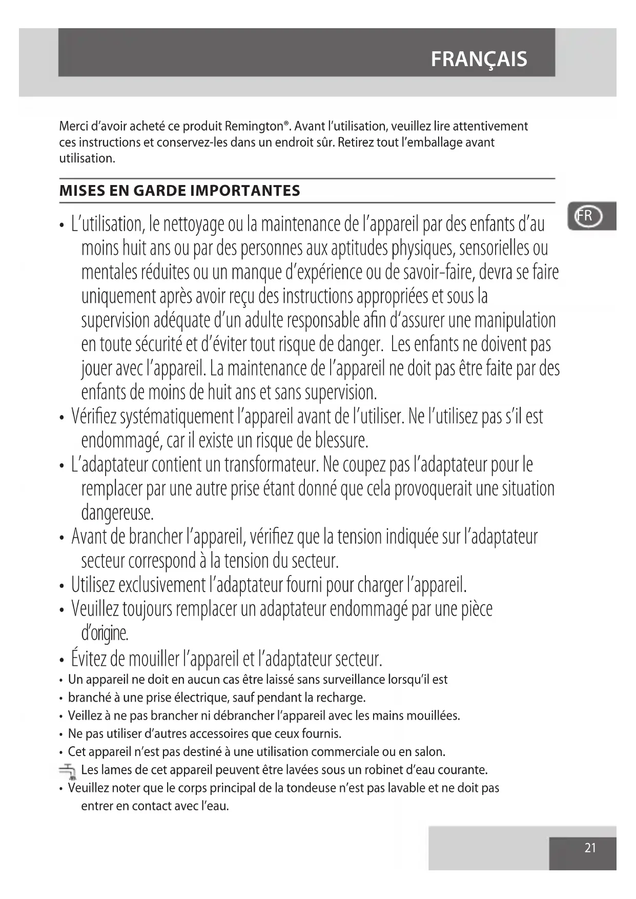 Merci d’avoir acheté ce produit Remington®. Avant l’utilisation, veuillez lire attentivement ces instructions et conservez-les dans un endroit sûr. Retirez tout l’emballage avant utilisation.