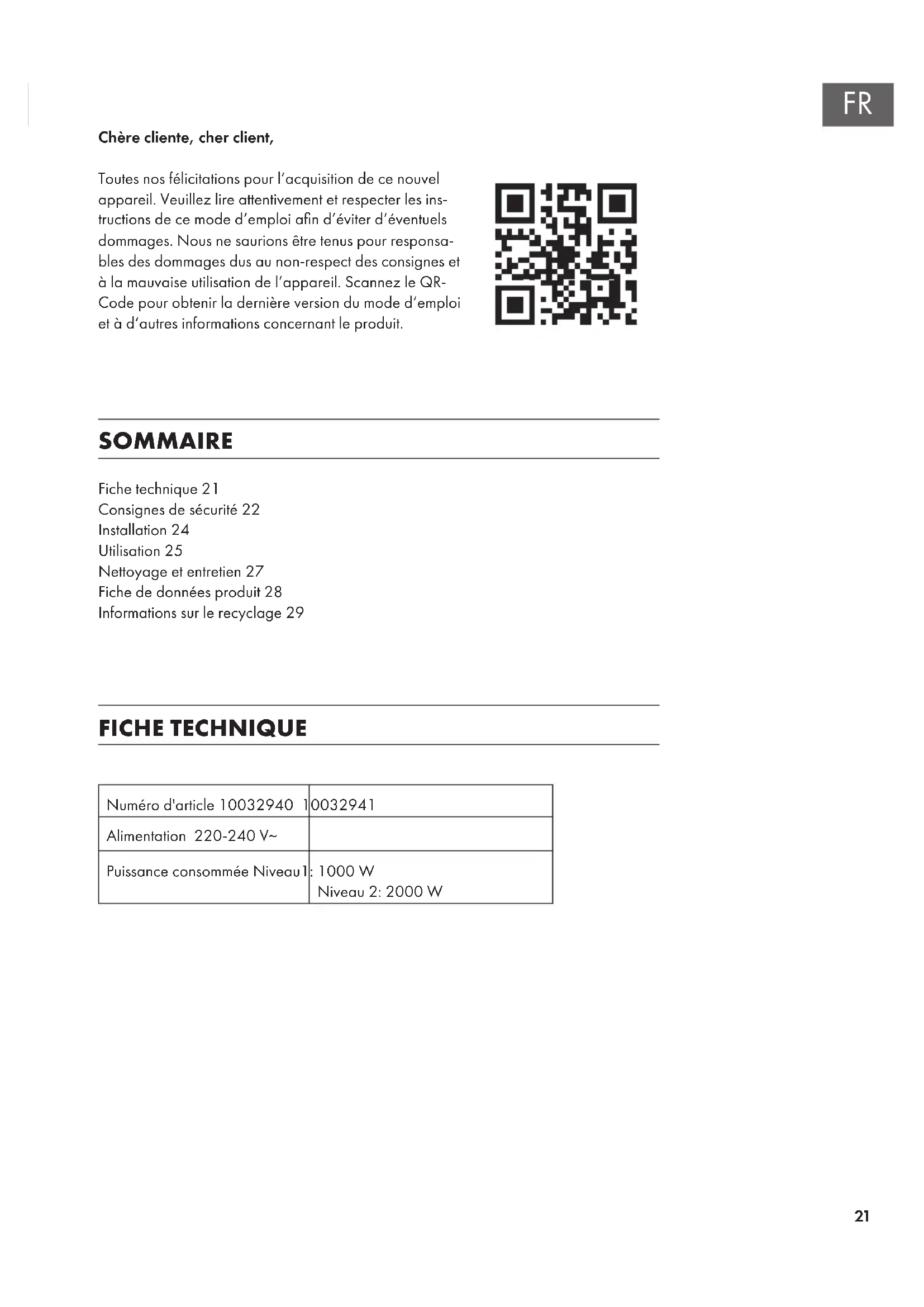 Fiche technique 21 Consignes de sécurité 22 Installation 24 Utilisation 25 Nettoyage et entretien 27 Fiche de données produit 28 Informations sur le recyclage 29 Chère cliente, cher client, Toutes nos félicitations pour l’acquisition de ce nouvel appareil. Veuillez lire attentivement et respecter les ins- tructions de ce mode d’emploi an d’éviter d’éventuels dommages. Nous ne saurions être tenus pour responsa- bles des dommages dus au non-respect des consignes et à la mauvaise utilisation de l’appareil. Scannez le QR- Code pour obtenir la dernière version du mode d‘emploi et à d‘autres informations concernant le produit. SOMMAIRE FICHE TECHNIQUE Numéro d'article 10032940 10032941 Alimentation 220-240 V~ Puissance consommée Niveau1: 1000 W Niveau 2: 2000 W22