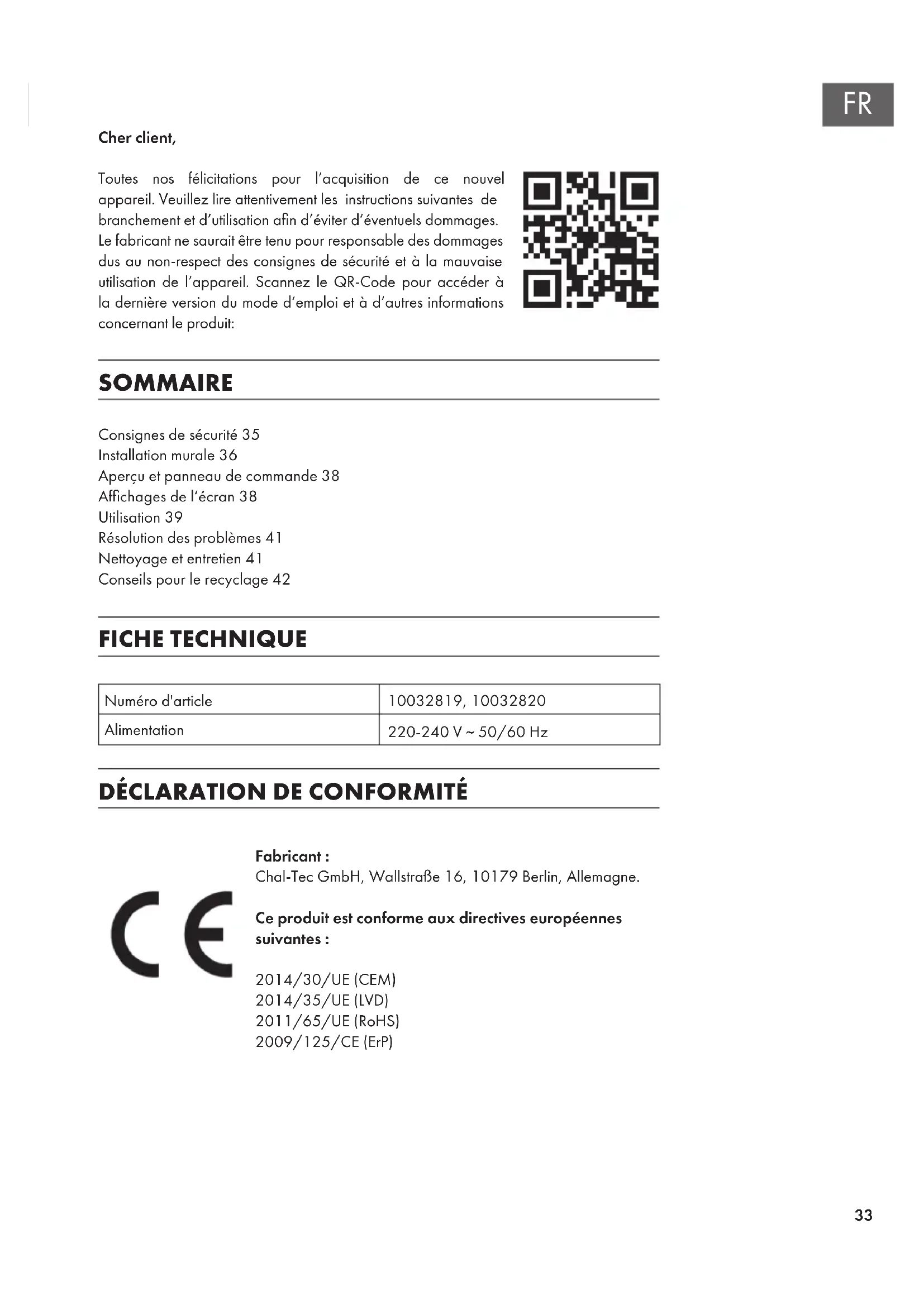 Cher client, Toutes nos félicitations pour l’acquisition de ce nouvel appareil. Veuillez lire attentivement les instructions suivantes de branchement et d’utilisation an d’éviter d’éventuels dommages. Le fabricant ne saurait être tenu pour responsable des dommages dus au non-respect des consignes de sécurité et à la mauvaise utilisation de l’appareil. Scannez le QR-Code pour accéder à la dernière version du mode d‘emploi et à d‘autres informations concernant le produit: SOMMAIRE Consignes de sécurité35 Installation murale36 Aperçu et panneau de commande38 Afchages de l‘écran38 Utilisation39 Résolution des problèmes41 Nettoyage et entretien41 Conseils pour le recyclage42 FICHE TECHNIQUE Numéro d'article 10032819, 10032820 Alimentation 220-240 V ~ 50/60 Hz