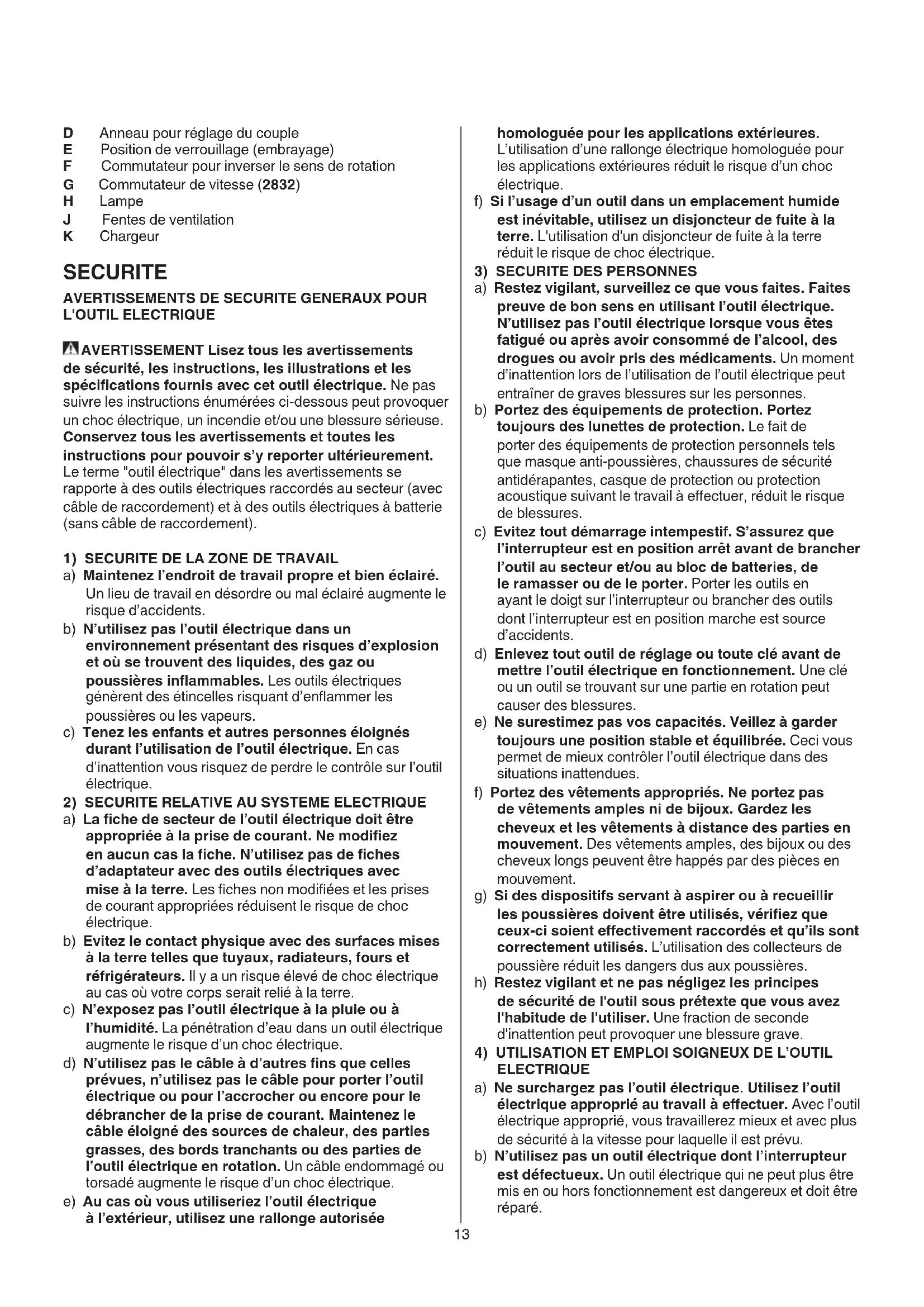 ELECTRIQUE a) Ne surchargez pas l’outil électrique. Utilisez l’outil électrique approprié au travail à eectuer. Avec l’outil électrique approprié, vous travaillerez mieux et avec plus de sécurité à la vitesse pour laquelle il est prévu. b) N’utilisez pas un outil électrique dont l’interrupteur est défectueux. Un outil électrique qui ne peut plus être mis en ou hors fonctionnement est dangereux et doit être réparé. D Anneau pour réglage du couple E Position de verrouillage (embrayage) F Commutateur pour inverser le sens de rotation G Commutateur de vitesse (2832) H Lampe J Fentes de ventilation K Chargeur SECURITE