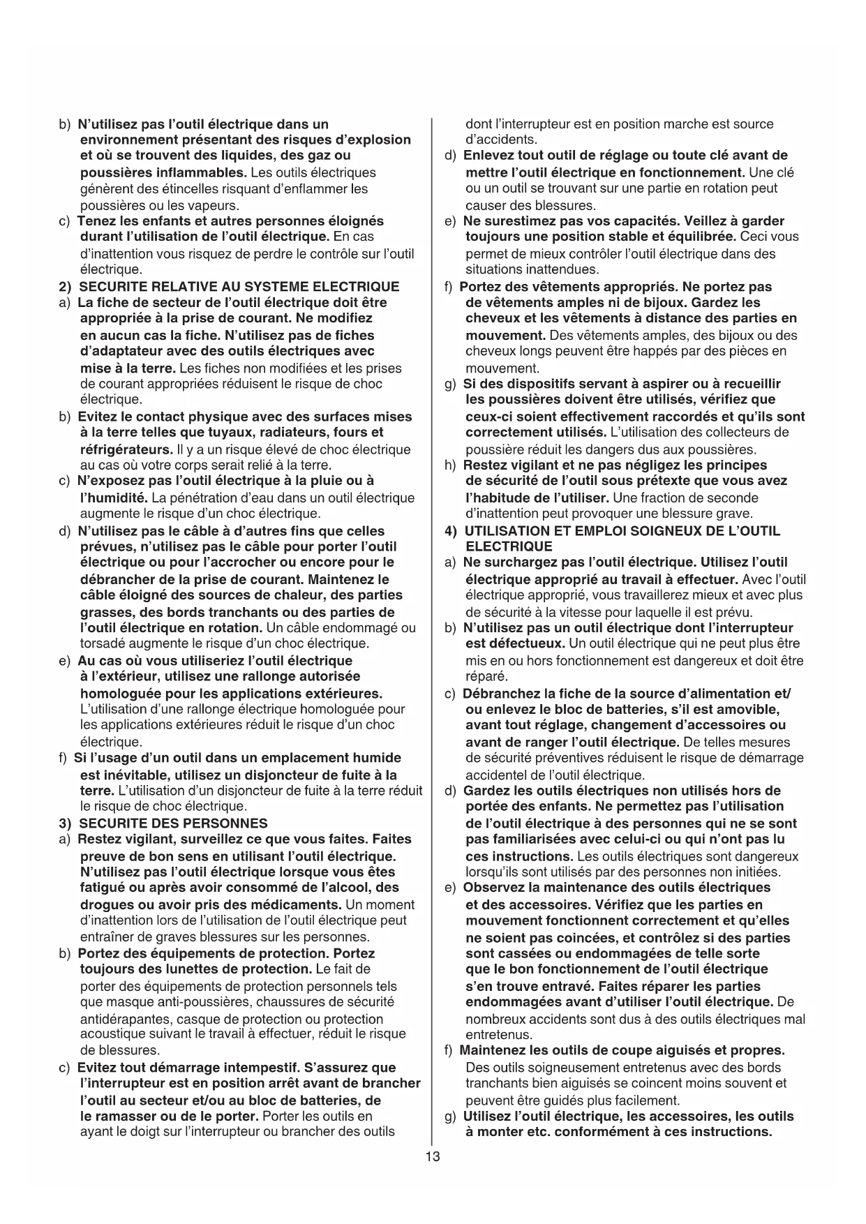 a) Restez vigilant, surveillez ce que vous faites. Faites preuve de bon sens en utilisant l’outil électrique. N’utilisez pas l’outil électrique lorsque vous êtes fatigué ou après avoir consommé de l’alcool, des drogues ou avoir pris des médicaments. Un moment d’inattention lors de l’utilisation de l’outil électrique peut entraîner de graves blessures sur les personnes. b) Portez des équipements de protection. Portez toujours des lunettes de protection. Le fait de porter des équipements de protection personnels tels que masque anti-poussières, chaussures de sécurité antidérapantes, casque de protection ou protection acoustique suivant le travail à eectuer, réduit le risque de blessures. c) Evitez tout démarrage intempestif. S’assurez que l’interrupteur est en position arrêt avant de brancher l’outil au secteur et/ou au bloc de batteries, de le ramasser ou de le porter. Porter les outils en ayant le doigt sur l’interrupteur ou brancher des outils14