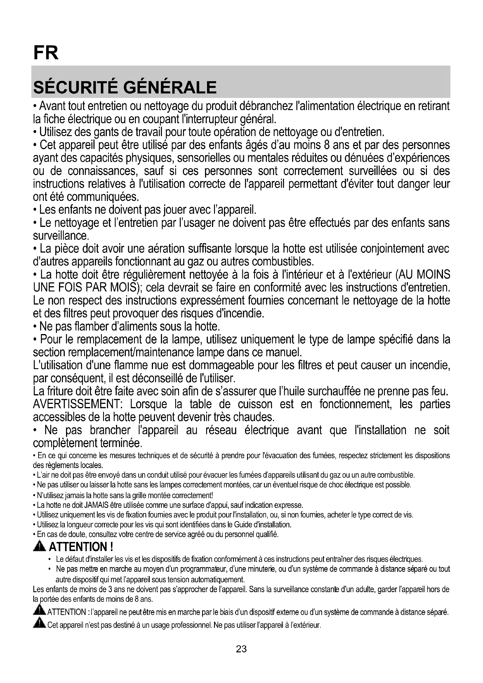 - Ne pas flamber d’aliments sous la hotte.