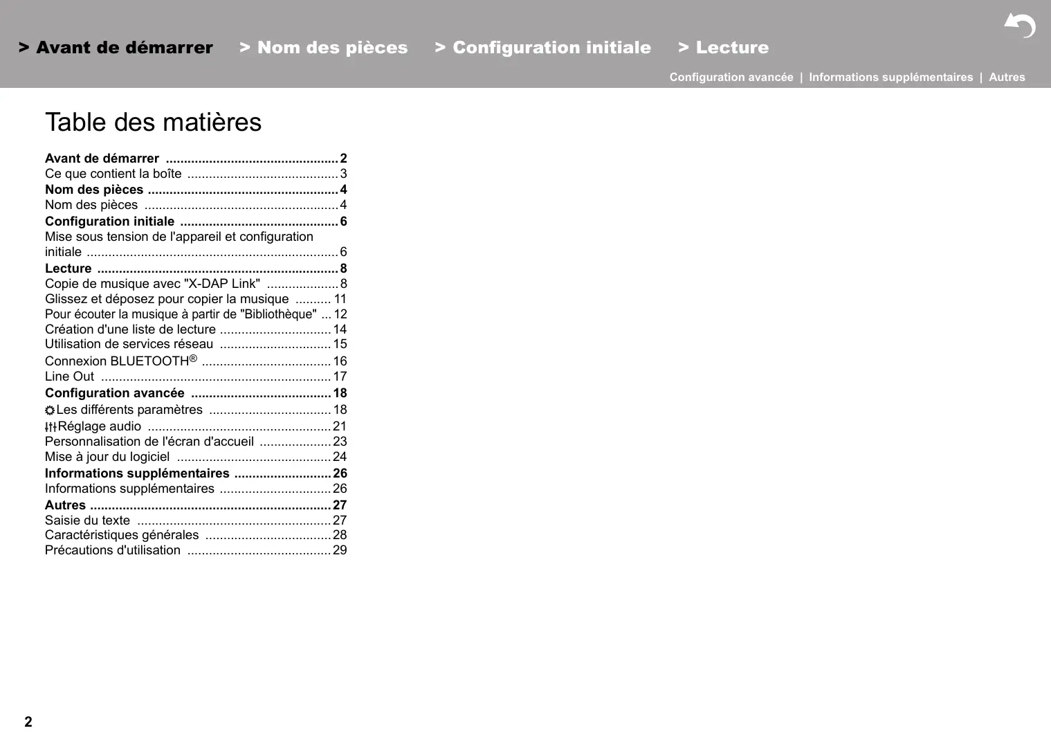 tels que les réglages Wi-Fi et BLUETOOTH (P18). 12.Illustration : Affiche l'illustration de l'album de la piste en cours de lecture. Touchez pour afficher l'écran de lecture. 13.Touche saut ( ) : Lance la lecture de la piste suivante. Appuyer longuement pour avancer rapidement dans la piste. 14.Touche Lecture/pause ( 15.Touche saut ( ) : Revient au début de la piste, ou sur la piste précédente. Appuyer longuement pour revenir rapidement en arrière. 16.Logement de la carte micro SD 1 17.Logement de la carte micro SD 2 0 Lorsque vous insérez la carte micro SD dans le logement spécialement prévu, veillez à l'introduire avec les bornes vers le haut et poussez complètement la carte jusqu'à ce qu'elle se mette en place. 0 Pour retirer la carte micro SD, il est tout d'abord nécessaire de la démonter (P29). Après l'avoir démontée, appuyez sur la carte micro SD jusqu'à ce que vous entendiez un clic puis retirez-la. Il se peut que la carte micro SD soit éjectée, faites attention de ne pas la perdre. 18.Prise casque ( ) : Branchez un casque compatible doté d'une sortie symétrique. (2,5 mm/4 conducteurs) 19.Prise casque ( ) : Branchez un casque normal. (3,5mm/3 conducteurs) 0 Cet appareil ne prend pas en charge l'utilisation simultanée de la prise casque symétrique et de la prise casque. Utiliser ces deux prises en même temps peut causer des dommages. 20.Voyant de chargement : Ce voyant s'allume de couleur blanche lorsque le chargement commence. Il s'éteint lorsque le chargement est terminé. Si l'appareil présente une condition qui empêche le chargement, ce voyant clignote de couleur blanche. Essayez d'effectuer de nouveau le chargement après avoir attendu un moment. 21.Touche d'alimentation (Í) : Appuyez quelques instants sur la touche d'alimentation pour mettre l'appareil sous tension. Pour éteindre l'appareil, appuyez sur la touche d'alimentation et maintenez-la pressée jusqu'à ce que l'écran "Extinction?" s'affiche. Vous pouvez ensuite éteindre l'appareil en touchant "Oui". Pour allumer ou éteindre l'écran, appuyez brièvement sur la touche. 0 Si le fonctionnement devient instable, vous pouvez éteindre l'appareil en maintenant la touche d'alimentation pressée pendant au minimum 10 secondes. Consultez "Si le fonctionnement devient instable" (P29) pour plus de détails. 22.Port micro USB : Pour charger l'appareil (P6) ou transférer des fichiers de musique (P8, P11), branchez le câble micro USB fourni. 23.Bouton de VERROUILLAGE: Vous pouvez verrouiller les opérations sur cet appareil en actionnant le bouton vers le haut. Lorsque le réglage "Actions tout en maintenant" (P19) est sur "Activer", la molette de volume et les boutons latéraux de lecture, etc., peuvent toujours être utilisés. Fr 5 > Avant de démarrer > Nom des pièces > Lecture Configuration avancée | Informations supplémentaires | Autres Mise sous tension de l'appareil et configuration initiale Configuration initiale Démarrage automatique de la Configuration initiale