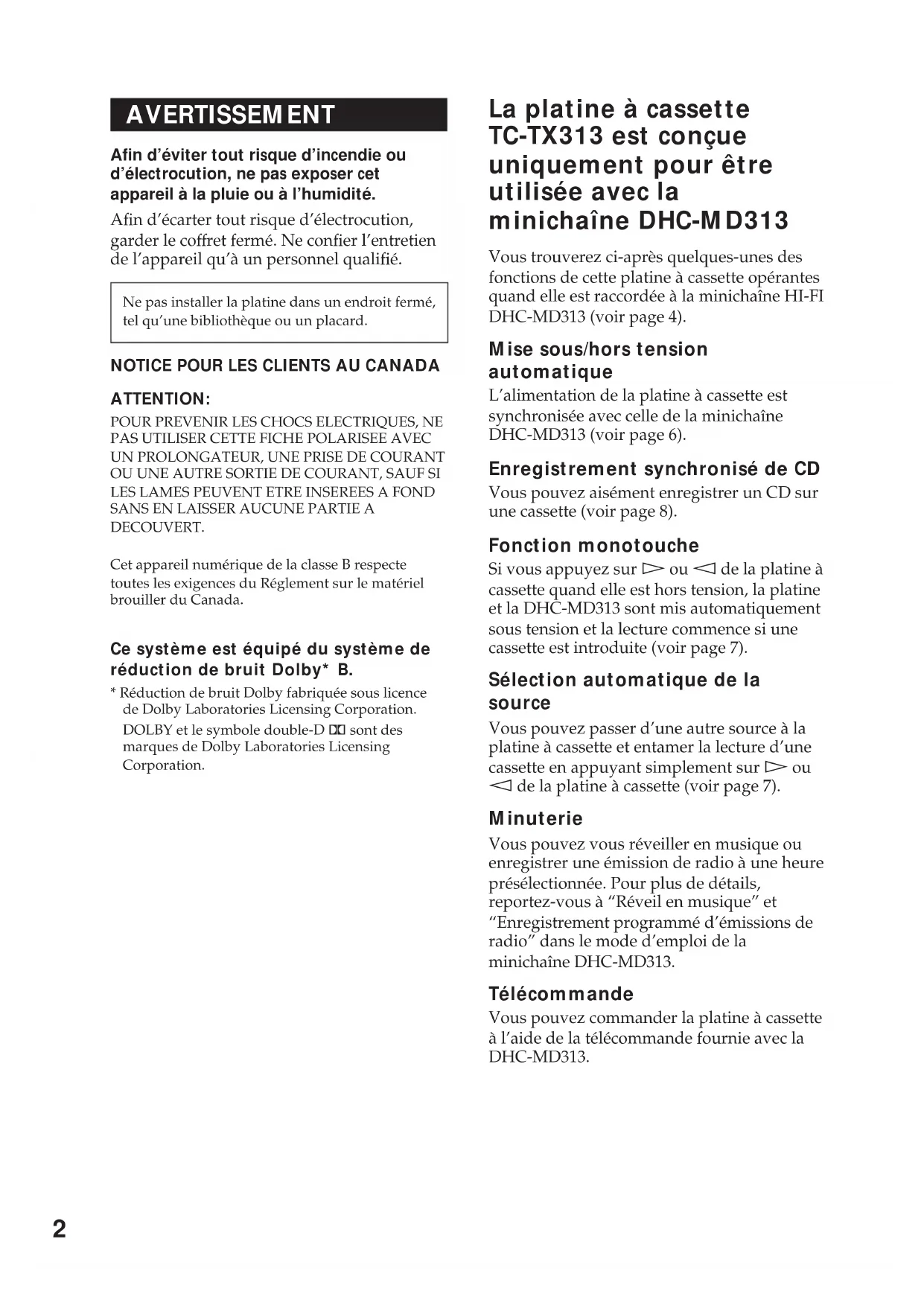 ES2 La platine à cassette TC-TX313 est conçue uniquement pour être utilisée avec la minichaîne DHC-MD313 Vous trouverez ci-après quelques-unes des fonctions de cette platine à cassette opérantes quand elle est raccordée à la minichaîne HI-FI DHC-MD313 (voir page 4). Mise sous/hors tension automatique L’alimentation de la platine à cassette est synchronisée avec celle de la minichaîne DHC-MD313 (voir page 6). Enregistrement synchronisé de CD Vous pouvez aisément enregistrer un CD sur une cassette (voir page 8). Fonction monotouche Si vous appuyez sur · ou ª de la platine à cassette quand elle est hors tension, la platine et la DHC-MD313 sont mis automatiquement sous tension et la lecture commence si une cassette est introduite (voir page 7). Sélection automatique de la source Vous pouvez passer d’une autre source à la platine à cassette et entamer la lecture d’une cassette en appuyant simplement sur · ou ª de la platine à cassette (voir page 7). Minuterie Vous pouvez vous réveiller en musique ou enregistrer une émission de radio à une heure présélectionnée. Pour plus de détails, reportez-vous à “Réveil en musique” et “Enregistrement programmé d’émissions de radio” dans le mode d’emploi de la minichaîne DHC-MD313. Télécommande Vous pouvez commander la platine à cassette à l’aide de la télécommande fournie avec la DHC-MD313. Ne pas installer la platine dans un endroit fermé, tel qu’une bibliothèque ou un placard. AVERTISSEMENT Afin d’éviter tout risque d’incendie ou d’électrocution, ne pas exposer cet appareil à la pluie ou à l’humidité. Afin d’écarter tout risque d’électrocution, garder le coffret fermé. Ne confier l’entretien de l’appareil qu’à un personnel qualifié.