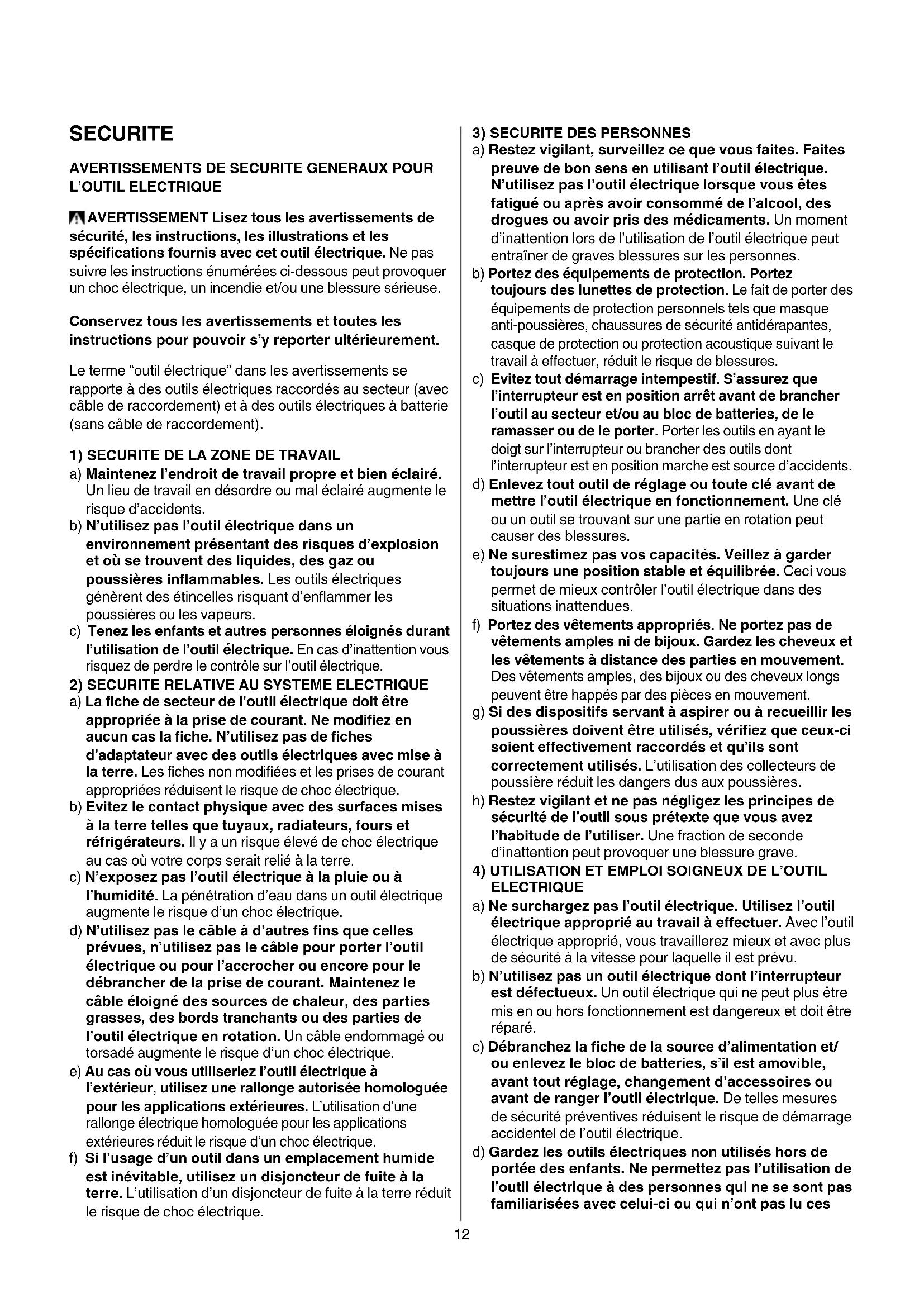 AVERTISSEMENT Lisez tous les avertissements de sécurité, les instructions, les illustrations et les spécifications fournis avec cet outil électrique. Ne pas suivre les instructions énumérées ci-dessous peut provoquer un choc électrique, un incendie et/ou une blessure sérieuse. Conservez tous les avertissements et toutes les instructions pour pouvoir s’y reporter ultérieurement. Le terme “outil électrique” dans les avertissements se rapporte à des outils électriques raccordés au secteur (avec câble de raccordement) et à des outils électriques à batterie (sans câble de raccordement).
