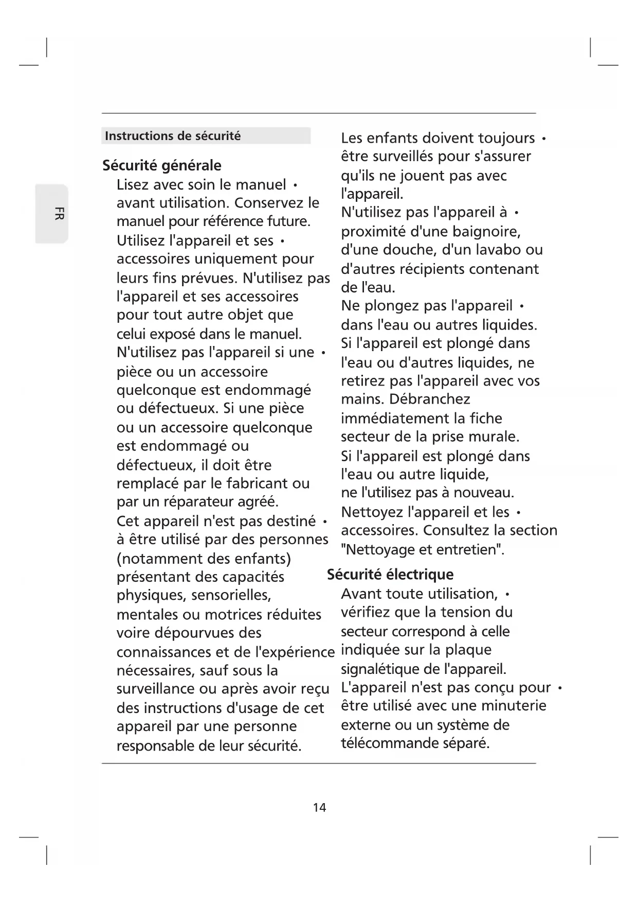 Instructions de sécurité Sécurité générale Lisez avec soin le manuel • avant utilisation. Conservez le manuel pour référence future. Utilisez l'appareil et ses • accessoires uniquement pour leurs fins prévues. N'utilisez pas l'appareil et ses accessoires pour tout autre objet que celui exposé dans le manuel. N'utilisez pas l'appareil si une • pièce ou un accessoire quelconque est endommagé ou défectueux. Si une pièce ou un accessoire quelconque est endommagé ou défectueux, il doit être remplacé par le fabricant ou par un réparateur agréé. Cet appareil n'est pas destiné • à être utilisé par des personnes (notamment des enfants) présentant des capacités physiques, sensorielles, mentales ou motrices réduites voire dépourvues des connaissances et de l'expérience nécessaires, sauf sous la surveillance ou après avoir reçu des instructions d'usage de cet appareil par une personne responsable de leur sécurité. Les enfants doivent toujours • être surveillés pour s'assurer qu'ils ne jouent pas avec l'appareil. N'utilisez pas l'appareil à • proximité d'une baignoire, d'une douche, d'un lavabo ou d'autres récipients contenant de l'eau. Ne plongez pas l'appareil • dans l'eau ou autres liquides. Si l'appareil est plongé dans l'eau ou d'autres liquides, ne retirez pas l'appareil avec vos mains. Débranchez immédiatement la fiche secteur de la prise murale. Si l'appareil est plongé dans l'eau ou autre liquide, ne l'utilisez pas à nouveau. Nettoyez l'appareil et les • accessoires. Consultez la section "Nettoyage et entretien". Sécurité électrique Avant toute utilisation, • vérifiez que la tension du secteur correspond à celle indiquée sur la plaque signalétique de l'appareil. L'appareil n'est pas conçu pour • être utilisé avec une minuterie externe ou un système de télécommande séparé.15