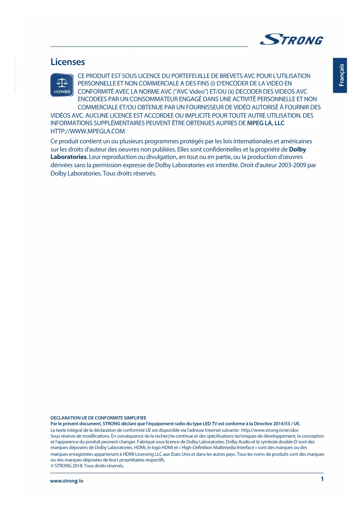 Par le présent document, STRONG déclare que l’équipement radio du type LED TV est conforme à la Directive 2014/53 / UE. Le texte intégral de la déclaration de conformité UE est disponible via l'adresse Internet suivante : http://www.strong.tv/en/doc Sous réserve de modifications. En conséquence de la recherche continue et des spécifications techniques de développement, la conception et l'apparence du produit peuvent changer. Fabriqué sous licence de Dolby Laboratories. Dolby Audio et le symbole double-D sont des marques déposées de Dolby Laboratories. HDMI, le logo HDMI et « High-Definition Multimedia Interface » sont des marques ou des marques enregistrées appartenant à HDMI Licensing LLC aux Etats Unis et dans les autres pays. Tous les noms de produits sont des marques ou des marques déposées de leurs propriétaires respectifs. © STRONG 2018. Tous droits réservés.
