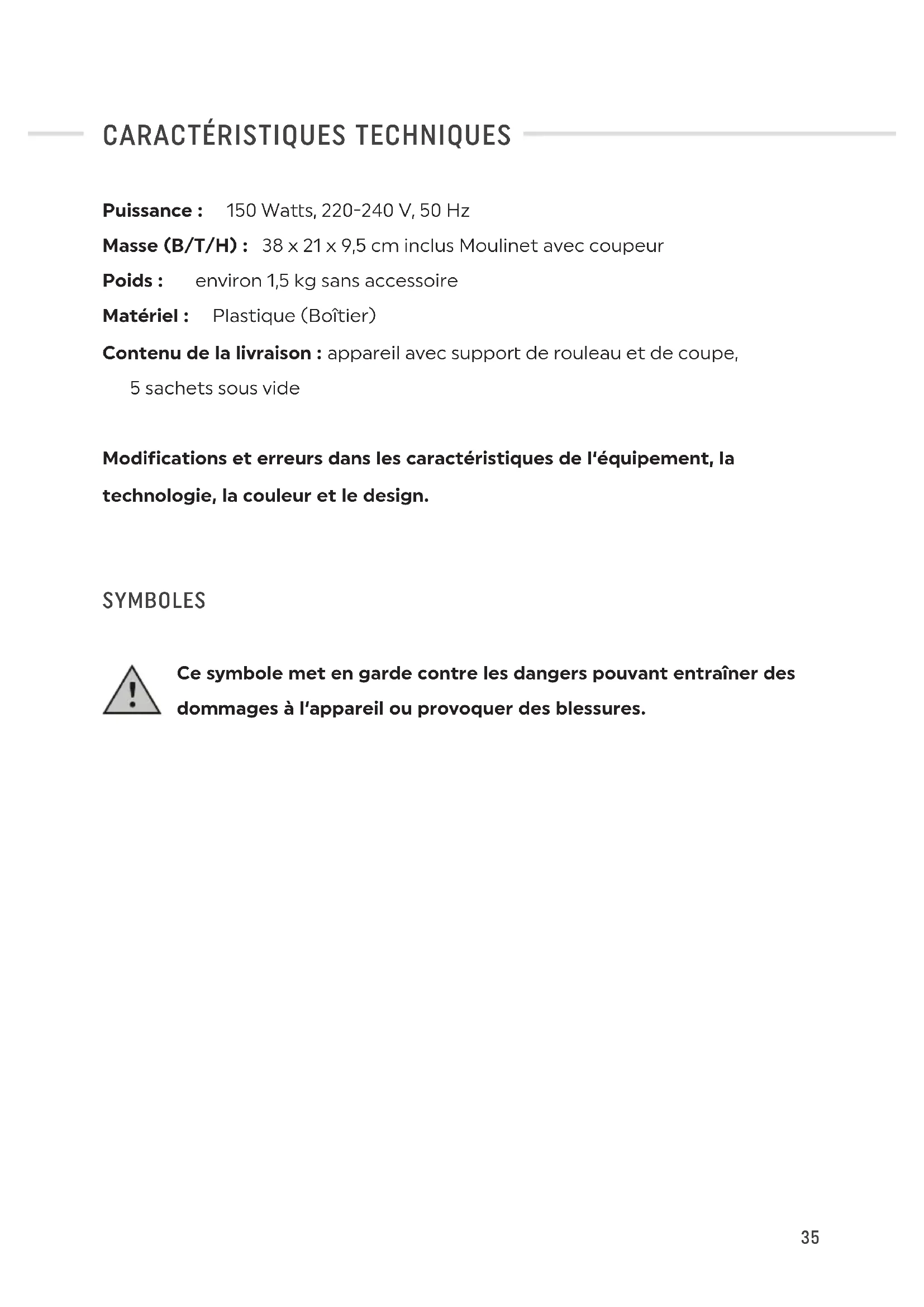 | Caractéristiques techniques | Appareil à emballage sous vide avec contrôle automatique de la pression et de la température. |