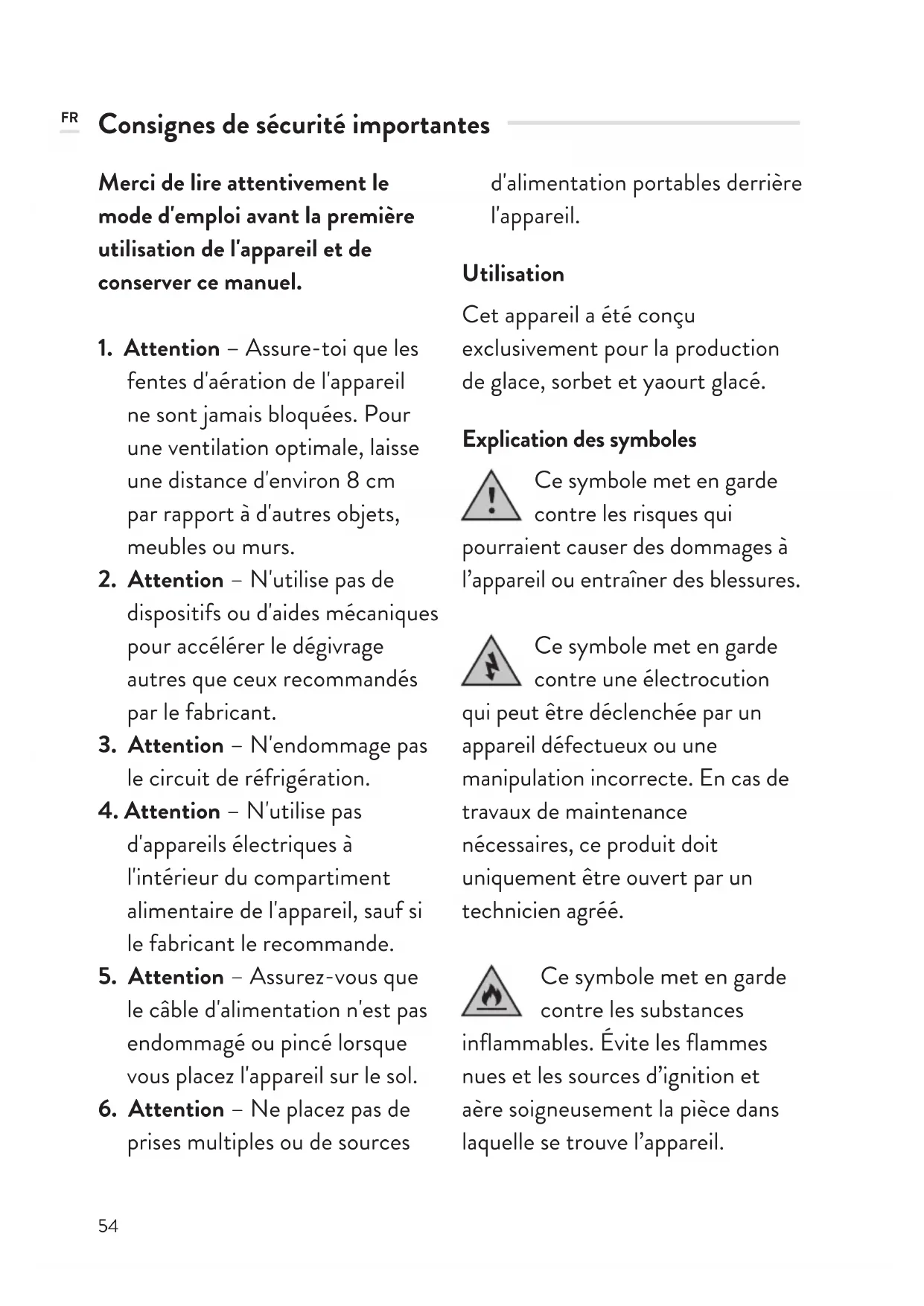 prises multiples ou de sources d'alimentation portables derrière l'appareil. Utilisation Cet appareil a été conçu exclusivement pour la production de glace, sorbet et yaourt glacé. Explication des symboles Ce symbole met en garde contre les risques qui pourraient causer des dommages à l’appareil ou entraîner des blessures. Ce symbole met en garde contre une électrocution qui peut être déclenchée par un appareil défectueux ou une manipulation incorrecte. En cas de travaux de maintenance nécessaires, ce produit doit uniquement être ouvert par un technicien agréé. Ce symbole met en garde contre les substances inflammables. Évite les flammes nues et les sources d’ignition et aère soigneusement la pièce dans laquelle se trouve l’appareil. FR55 Consignes de sécurité Ne stocke aucune substance explosive dans cet appareil, par exemple des flacons aérosols contenant un gaz propulsif inflammable. Ne plonge jamais l'appareil dans l'eau ou dans tout autre liquide et protège le câble d'alimentation, la fiche de secteur et le bloc d'alimentation de l'humidité. Ne mets pas les mains dans l’appareil pendant son fonctionnement en raison du risque de blessure ! Assure-toi que l'appareil ne soit jamais incliné à plus de 45°, sinon le compresseur pourrait être endommagé. Laisse l’appareil à son emplacement final pendant au moins 2 heures après le déballage. Le liquide réfrigérant dans l'appareil doit d'abord s'abaisser, sinon le compresseur peut être endommagé. Le fabricant décline toute responsabilité en cas d'erreur de montage, d'une utilisation inadéquate ou incorrecte, ou après une réparation par des personnes tierces non autorisées. Attention : risque d'incendie ! Le circuit de refroidissement contient de l’isobutane (R600a), un gaz naturel et respectueux de l’environnement, mais inflammable. Assure-toi que le circuit de refroidissement n'a pas été endommagé pendant le transport ou lors de l'installation de l'appareil. Le liquide réfrigérant (R600a) est inflammable. Si le circuit de refroidissement est endommagé :