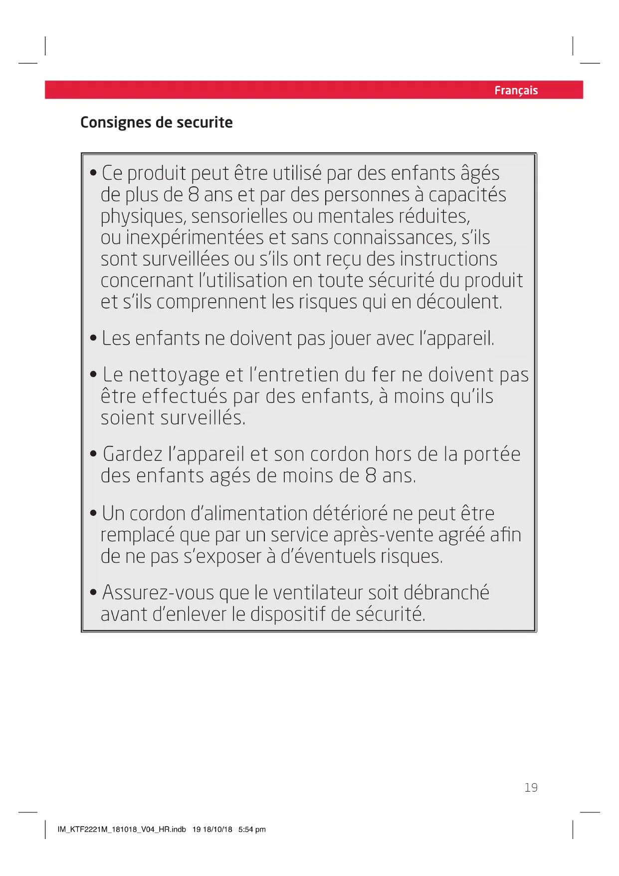 - Assurez-vous que le ventilateur soit débranché avant d'enlever le dispositif de sécurité. IM_KTF2221M_181018_V04_HR.indb 19 18/10/18 5:54 pmFrançais