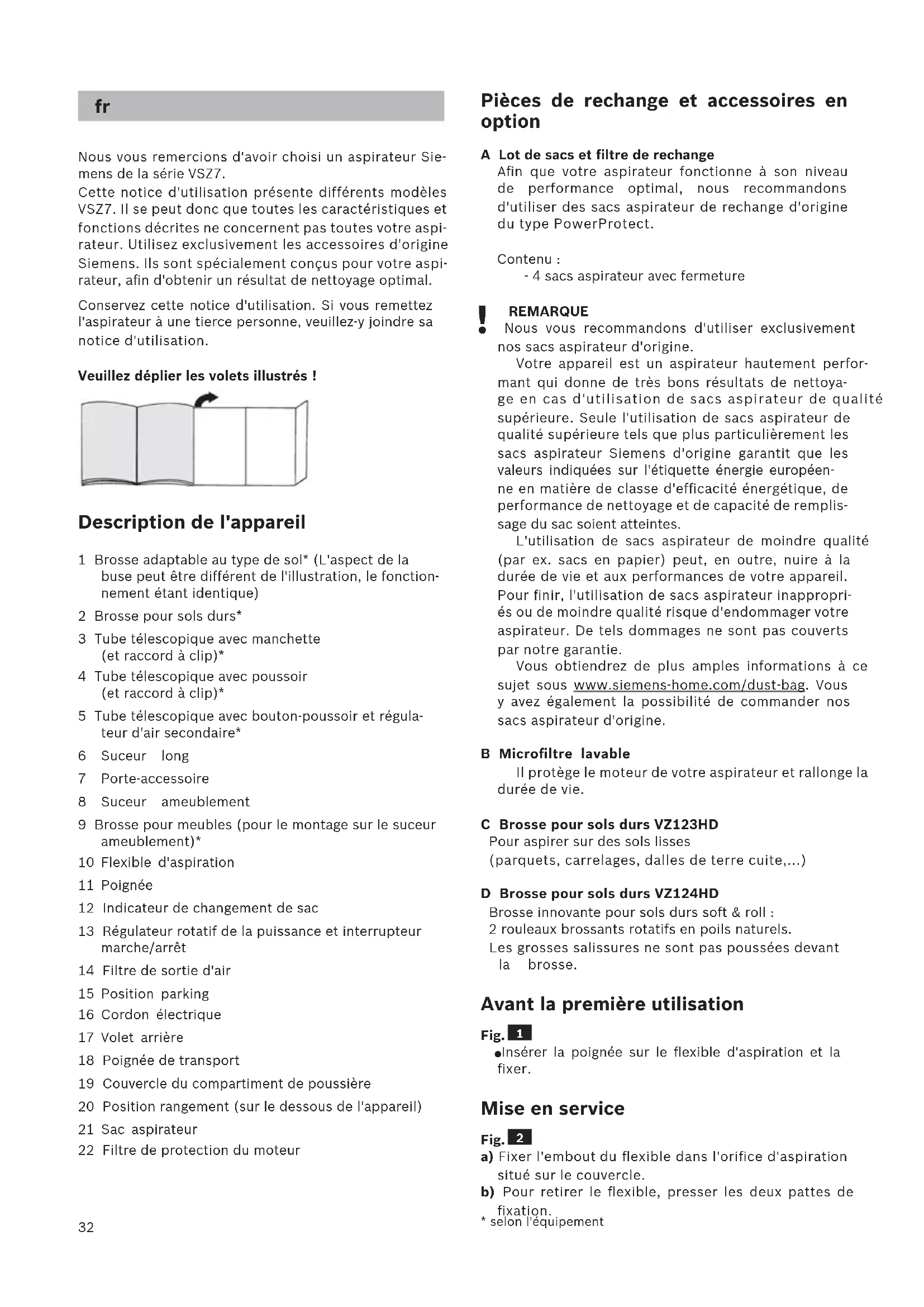 - Depending on model32 Nous vous remercions d'avoir choisi un aspirateur Sie- mens de la série VSZ7. Cette notice d'utilisation présente différents modèles VSZ7. Il se peut donc que toutes les caractéristiques et fonctions décrites ne concernent pas toutes votre aspi- rateur. Utilisez exclusivement les accessoires d'origine Siemens. Ils sont spécialement conçus pour votre aspi- rateur, afin d'obtenir un résultat de nettoyage optimal. Conservez cette notice d'utilisation. Si vous remettez l'aspirateur à une tierce personne, veuillez-y joindre sa notice d'utilisation. Veuillez déplier les volets illustrés ! Description de l'appareil 1 Brosse adaptable au type de sol* (L'aspect de la buse peut être différent de l'illustration, le fonction- nement étant identique) 2 Brosse pour sols durs* 3 Tube télescopique avec manchette (et raccord à clip)* 4 Tube télescopique avec poussoir (et raccord à clip)* 5 Tube télescopique avec bouton-poussoir et régula- teur d'air secondaire* 6 Suceur long 7 Porte-accessoire 8 Suceur ameublement 9 Brosse pour meubles (pour le montage sur le suceur ameublement)* 10 Flexible d'aspiration 11 Poignée 12 Indicateur de changement de sac 13 Régulateur rotatif de la puissance et interrupteur marche/arrêt 14 Filtre de sortie d'air 15 Position parking 16 Cordon électrique 17 Volet arrière 18 Poignée de transport 19 Couvercle du compartiment de poussière 20 Position rangement (sur le dessous de l'appareil) 21 Sac aspirateur 22 Filtre de protection du moteur Pièces de rechange et accessoires en option A Lot de sacs et filtre de rechange Afin que votre aspirateur fonctionne à son niveau de performance optimal, nous recommandons d'utiliser des sacs aspirateur de rechange d'origine du type PowerProtect. Contenu : - 4 sacs aspirateur avec fermeture