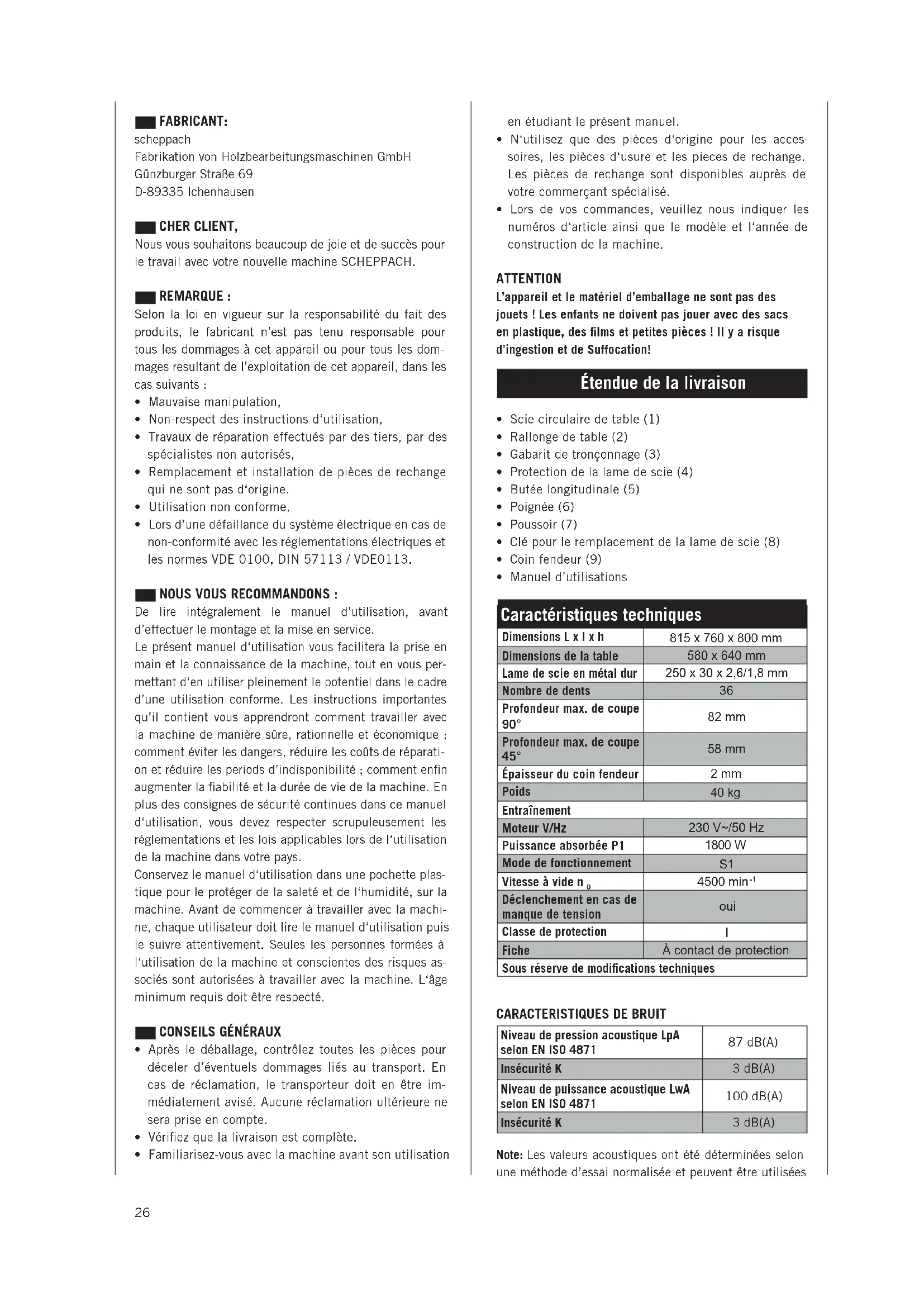 - Manuel d’utilisations Caractéristiques techniques Dimensions L x l x h 815 x 760 x 800 mm Dimensions de la table 580 x 640 mm Lame de scie en métal dur 250 x 30 x 2,6/1,8 mm Nombre de dents