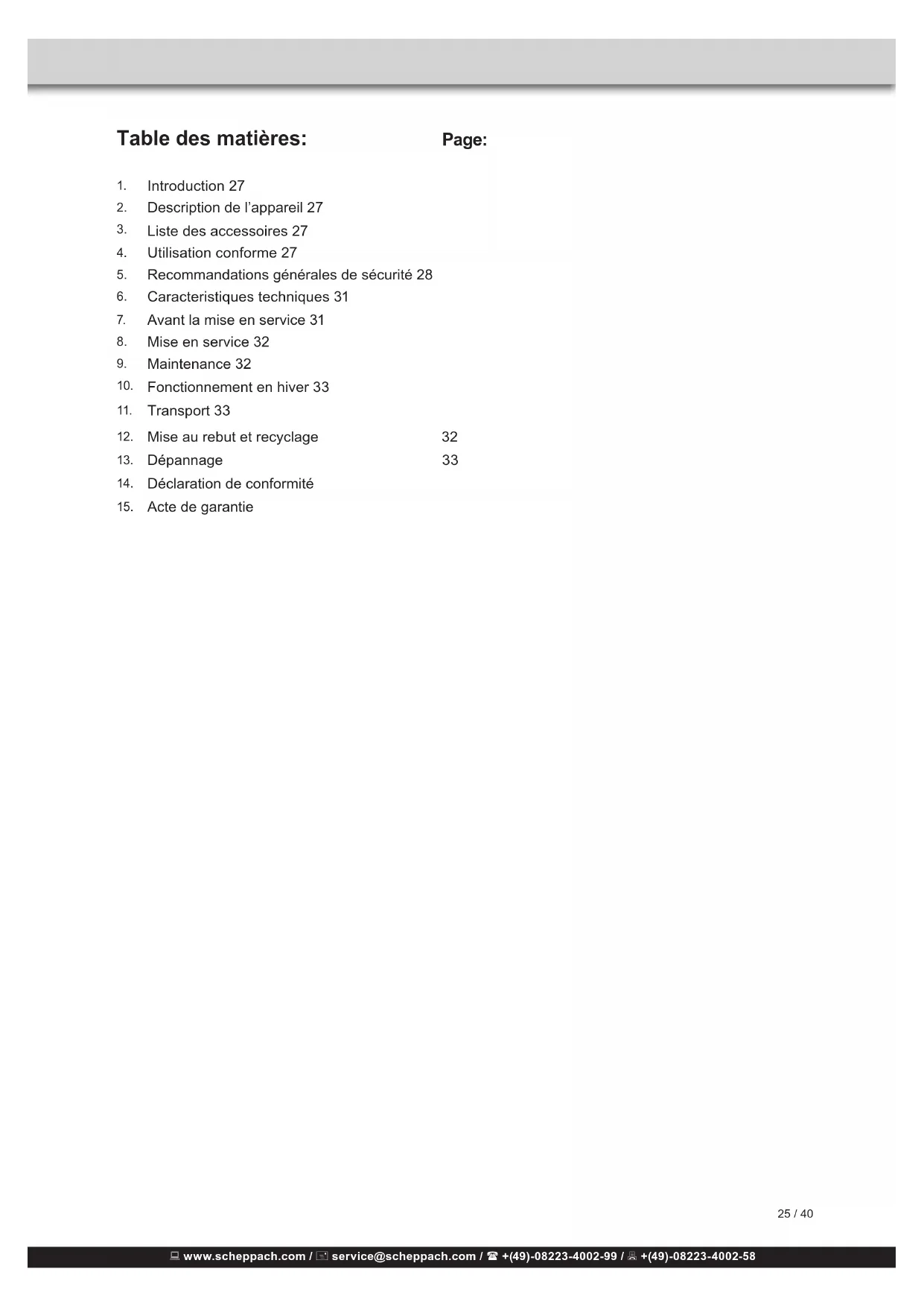 Les consignes d’élimination sont indiquées sous forme de pictogrammes apposés sur l’appareil ou sur l’emballage. La description des signications indivi- duelles se trouve dans le chapitre « Explication des symboles sur l’appareil ». Elimination de l’emballage L’emballage protège l’appareil contre les chocs lors du transport. En général, le matériel d’emballage est choisi de façon à ce qu’il réponde aux règles de protection de l’environnement et d’élimination des dé- chets, par conséquent, il peut être recyclé. La remise de l’emballage dans le circuit des matières premières permet de les économiser et de réduire les déchets. Des éléments de l’emballage (tels que les lms, le polystyrène) peuvent être dangereux pour les en- fants. Risque d’étouffement ! Placez les éléments de l’emballage hors de portée des enfants et élimi- nez-les le plus rapidement possible. www.scheppach.com / service@scheppach.com / +(49)-08223-4002-99 / +(49)-08223-4002-58 www.scheppach.com / service@scheppach.com / +(49)-08223-4002-99 / +(49)-08223-4002-58 36 / 40 www.scheppach.com / service@scheppach.com / +(49)-08223-4002-99 / +(49)-08223-4002-58 www.scheppach.com / service@scheppach.com / +(49)-08223-4002-99 / +(49)-08223-4002-58