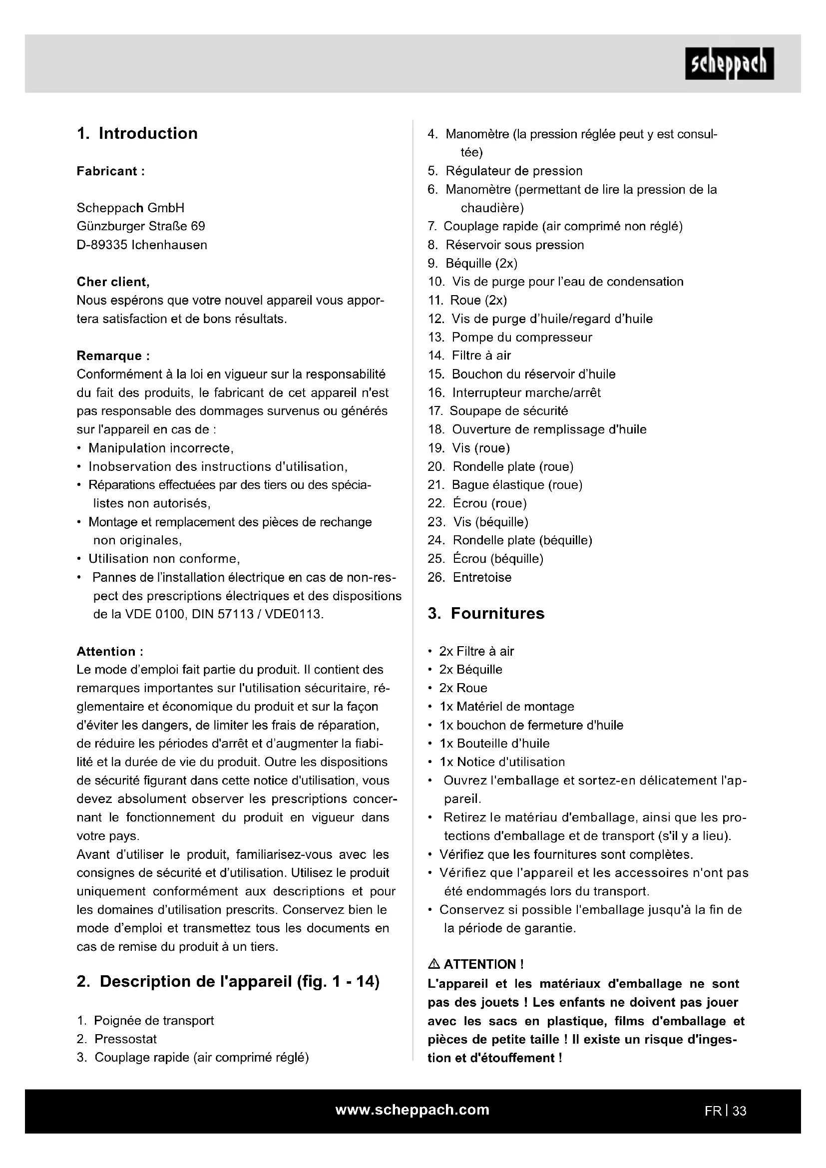 Fabricant : Scheppach GmbH Günzburger Straße 69 D-89335 Ichenhausen Cher client, Nous espérons que votre nouvel appareil vous appor- tera satisfaction et de bons résultats. Remarque : Conformément à la loi en vigueur sur la responsabilité du fait des produits, le fabricant de cet appareil n'est pas responsable des dommages survenus ou générés sur l'appareil en cas de :