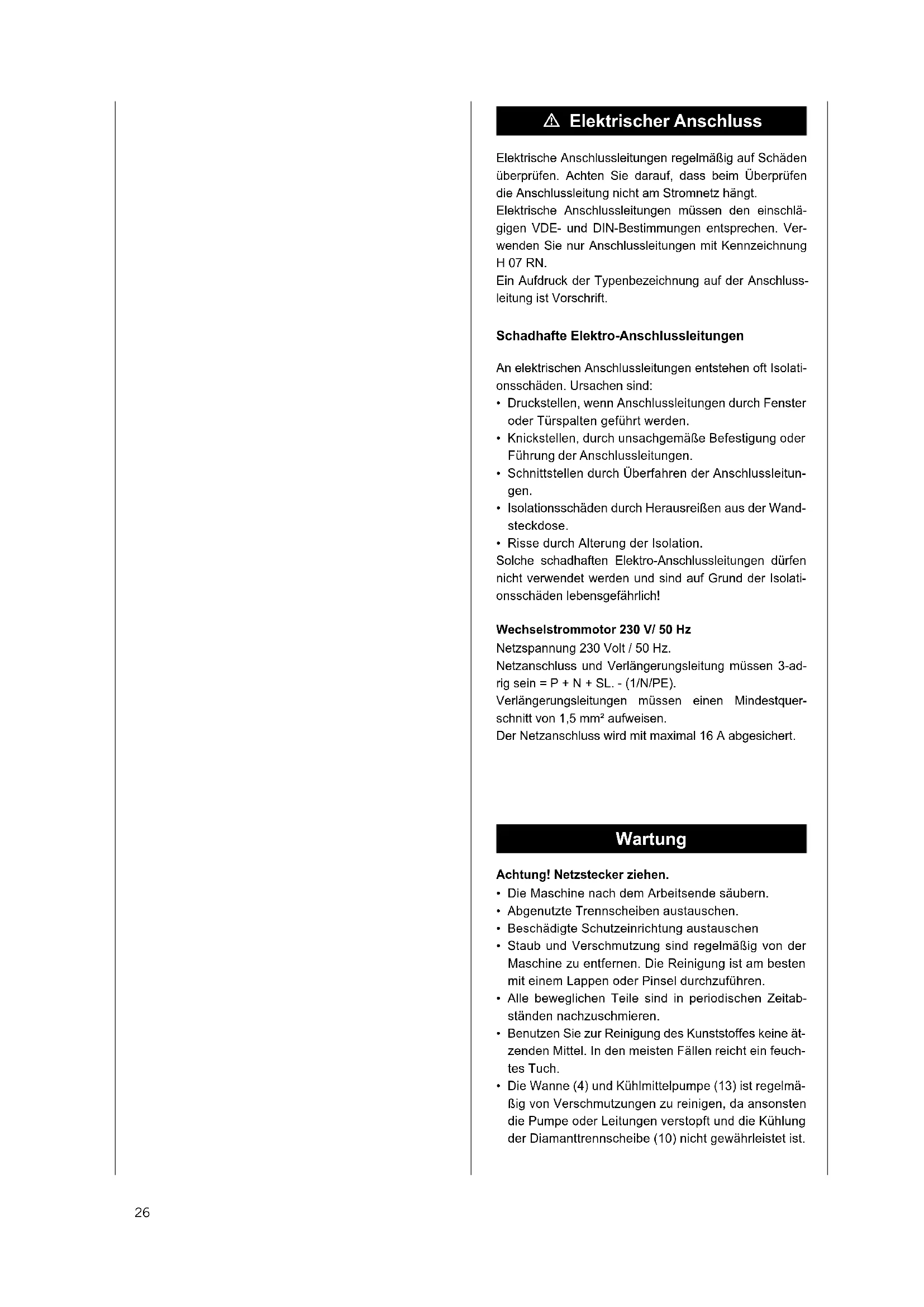 - The tub (4) and coolant pump (13) must be cleaned regularly to remove dirt, as otherwise the pump or the pipe or the cooling of the diamond cutting disc (10) is not guaranteed. m Raccordement électrique Vériez régulièrement que les connexions électriques ne sont pas endommagées. Veillez, lors du contrôle, que la connexion électrique ne soit pas branchée. Les connexions électriques doivent satisfaire aux règles pertinentes VDE et DIN. N’utilisez que des connexions électriques marquées H 07 RN. L’empreinte de la désignation du type sur la connexion électrique est une obligation. Connexions électriques défectueuses Des dommages d’isolation surgissent fréquemment sur les connexions électriques. Les causes en sont:
