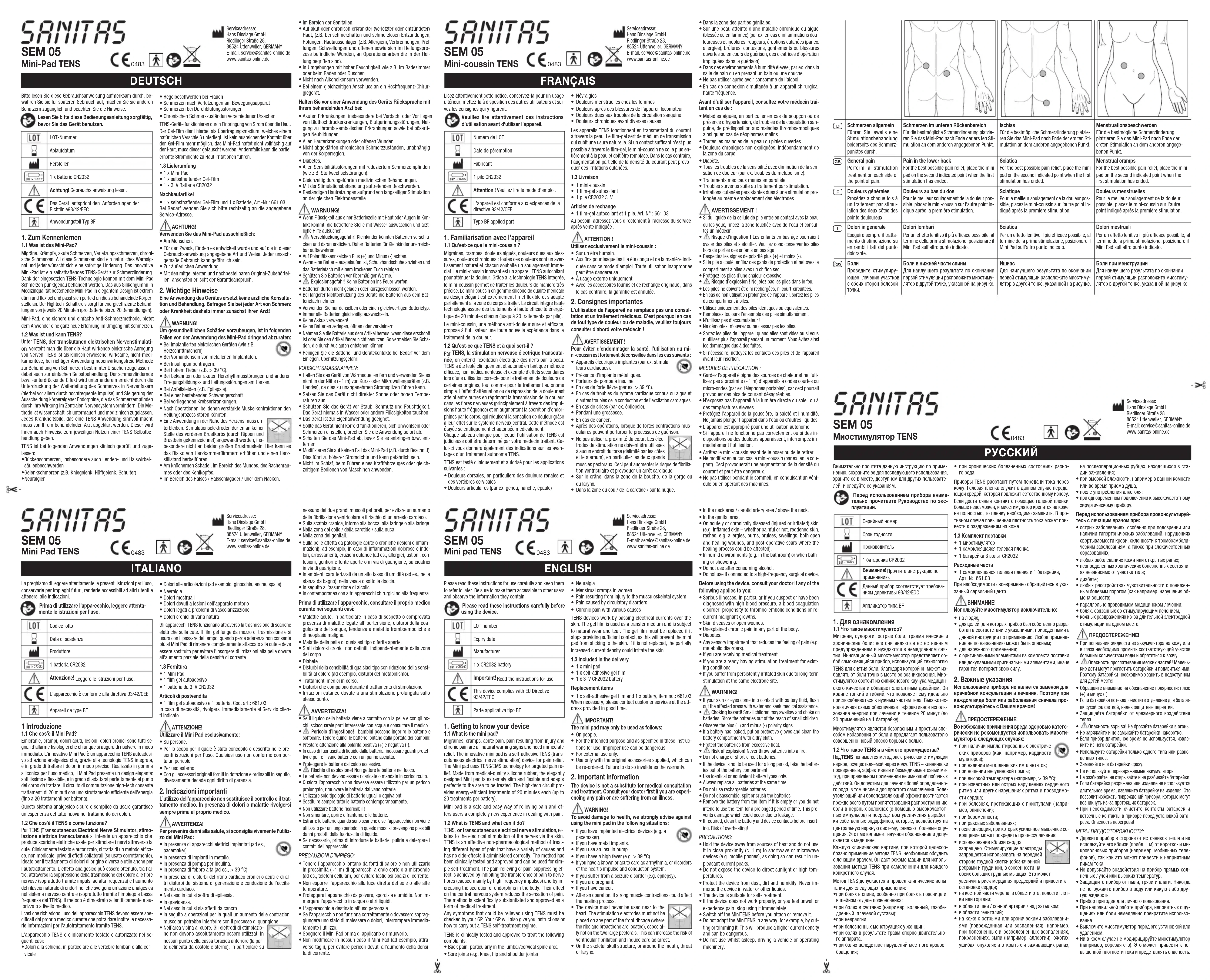 L’utilisation de l’appareil ne remplace pas une consul-tation et un traitement médicaux. C’est pourquoi en cas de tout type de douleur ou de maladie, veuillez toujours consulter d’abord votre médecin! AVERTISSEMENT!Pour éviter d’endommager la santé, l’utilisation du mi-ni-coussin est fortement déconseillée dans les cas suivants: Appareils électriques implantés (par ex. stimula-teurs cardiaques). Présence d’implants métalliques. Porteurs de pompe à insuline. En cas de forte fièvre (par ex. > 39 °C). En cas de troubles du rythme cardiaque connus ou aigus et d’autres troubles de la conduction et de l’excitation cardiaques. En cas de crises (par ex. épilepsie). Pendant une grossesse. En cas de cancer. Après des opérations, lorsque de fortes contractions mus-culaires peuvent perturber le processus de guérison. Ne pas utiliser à proximité du cœur. Les élec-trodes de stimulation ne doivent être utilisées à aucun endroit du torse (délimité par les côtes et le sternum), en particulier les deux grands muscles pectoraux. Ceci peut augmenter le risque de fibrilla tion ventriculaire et provoquer un arrêt cardiaque. Sur le crâne, dans la zone de la bouche, de la gorge ou du larynx. Dans la zone du cou / de la carotide / sur la nuque. Dans la zone des parties génitales. Sur une peau atteinte d’une maladie chronique ou aiguë (blessée ou enflammée) (par ex. en cas d’inflammations dou-loureuses et indolores, rougeurs, éruptions cutanées (par ex. allergies), brûlures, contusions, gonflements ou blessures ouvertes ou en cours de guérison, des cicatrices d’opération impliquées dans la guérison). Dans des environnements à humidité élevée, par ex. dans la salle de bain ou en prenant un bain ou une douche. Ne pas utiliser après avoir consommé de l’alcool. En cas de connexion simultanée à un appareil chirurgical haute fréquence.Avant d’utiliser l’appareil, consultez votre médecin trai-tant en cas de: Maladies aiguës, en particulier en cas de soupçon ou de présence d’hypertension, de troubles de la coagulation san-guine, de prédisposition aux maladies thromboemboliques ainsi qu’en cas de néoplasmes malins. Toutes les maladies de la peau ou plaies ouvertes. Douleurs chroniques non expliquées, indépendamment de la zone du corps. Diabète. Tous les troubles de la sensibilité avec diminution de la sen-sation de douleur (par ex. troubles du métabolisme). Traitements médicaux menés en parallèle. Troubles survenus suite au traitement par stimulation. Irritations cutanées persistantes dues à une stimulation pro-longée au même emplacement des électrodes. AVERTISSEMENT! Si du liquide de la cellule de pile entre en contact avec la peau ou les yeux, rincez la zone touchée avec de l’eau et consul-tez un médecin. Risque d’ingestion ! Les enfants en bas âge pourraient avaler des piles et s’étouffer. Veuillez donc conserver les piles hors de portée des enfants en bas âge ! Respectez les signes de polarité plus (+) et moins (-). Si la pile a coulé, enfilez des gants de protection et nettoyez le compartiment à piles avec un chiffon sec. Protégez les piles d’une chaleur excessive. Risque d’explosion ! Ne jetez pas les piles dans le feu. Les piles ne doivent être ni rechargées, ni court-circuitées. En cas de non utilisation prolongée de l’appareil, sortez les piles du compartiment à piles. Utilisez uniquement des piles identiques ou équivalentes. Remplacez toujours l’ensemble des piles simultanément. N’utilisez pas d’accumulateur ! Ne démontez, n’ouvrez ou ne cassez pas les piles. Sortez les piles de l’appareil quand elles sont vides ou si vous n’utilisez plus l’appareil pendant un moment. Vous évitez ainsi les dommages dus à des fuites. Si nécessaire, nettoyez les contacts des piles et de l’appareil avant leur insertion.MESURES DE PRÉCAUTION: Gardez l’appareil éloigné des sources de chaleur et ne l’uti-lisez pas à proximité (~1m) d’appareils à ondes courtes ou micro-ondes (par ex. téléphones portables), car ceci pourrait provoquer des pics de courant désagréables. N’exposez pas l’appareil à la lumière directe du soleil ou à des températures élevées. Protégez l’appareil de la poussière, la saleté et l’humidité. Ne jamais plonger l’appareil dans l’eau ou d’autres liquides. L’appareil est approprié pour une utilisation autonome. Si l’appareil ne fonctionne pas correctement ou si des in-dispositions ou des douleurs apparaissent, interrompez im-médiatement l’utilisation. Arrêtez le mini-coussin avant de le poser ou de le retirer. Ne modifiez en aucun cas le mini-coussin (par ex. en le cou-pant). Ceci provoquerait une augmentation de la densité du courant et peut être dangereux. Ne pas utiliser pendant le sommeil, en conduisant un véhi-cule ou en opérant des machines. Schmerzen allgemein Führen Sie jeweils eine Stimulationsbehandlung beiderseits des Schmerz-punktes durch.Schmerzen im unteren RückenbereichFür die bestmögliche Schmerzlinderung platzie-ren Sie das Mini-Pad nach Ende der ers ten Sti-mulation an dem anderen angegebenen Punkt.IschiasFür die bestmögliche Schmerzlinderung platzie-ren Sie das Mini-Pad nach Ende der ers ten Sti-mulation an dem anderen angegebenen Punkt.Menstruations beschwerdenFür die bestmögliche Schmerzlinderung platzieren Sie das Mini-Pad nach Ende der ersten Stimulation an dem anderen angege-benen Punkt. General pain Perform a stimulation treatment on each side of the point of pain.Pain in the lower backFor the best possible pain relief, place the mini pad on the second indicated point when the first stimulation has ended.SciaticaFor the best possible pain relief, place the mini pad on the second indicated point when the first stimulation has ended.Menstrual crampsFor the best possible pain relief, place the mini pad on the second indicated point when the first stimulation has ended. Douleurs générale