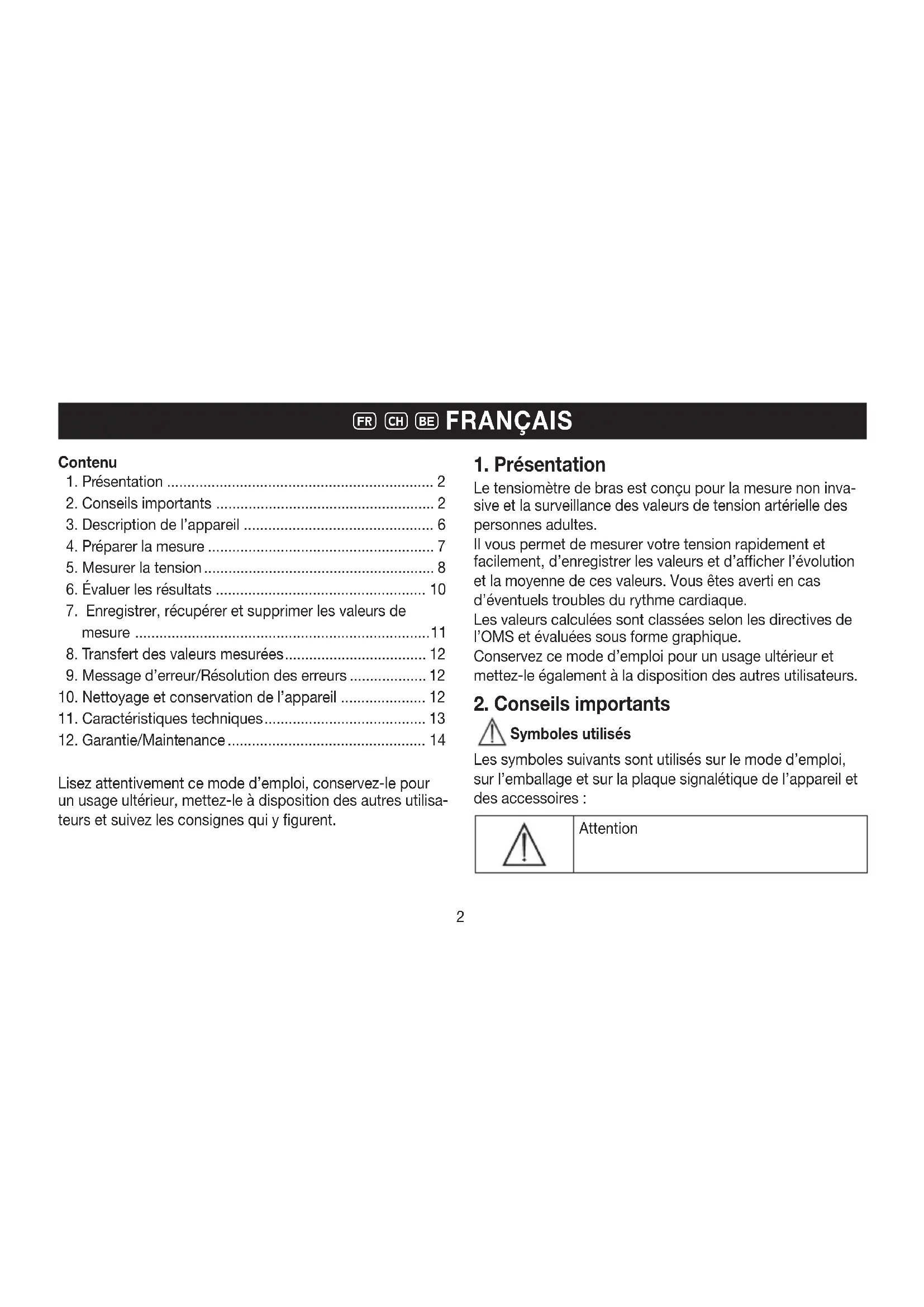 Tel.: 0800 724 2355 health coachF C ) FRANÇAIS Contenu Lisez attentivement ce mode d’emploi, conservez-le pour un usage ultérieur, mettez-le à disposition des autres utilisa- teurs et suivez les consignes qui y figurent.