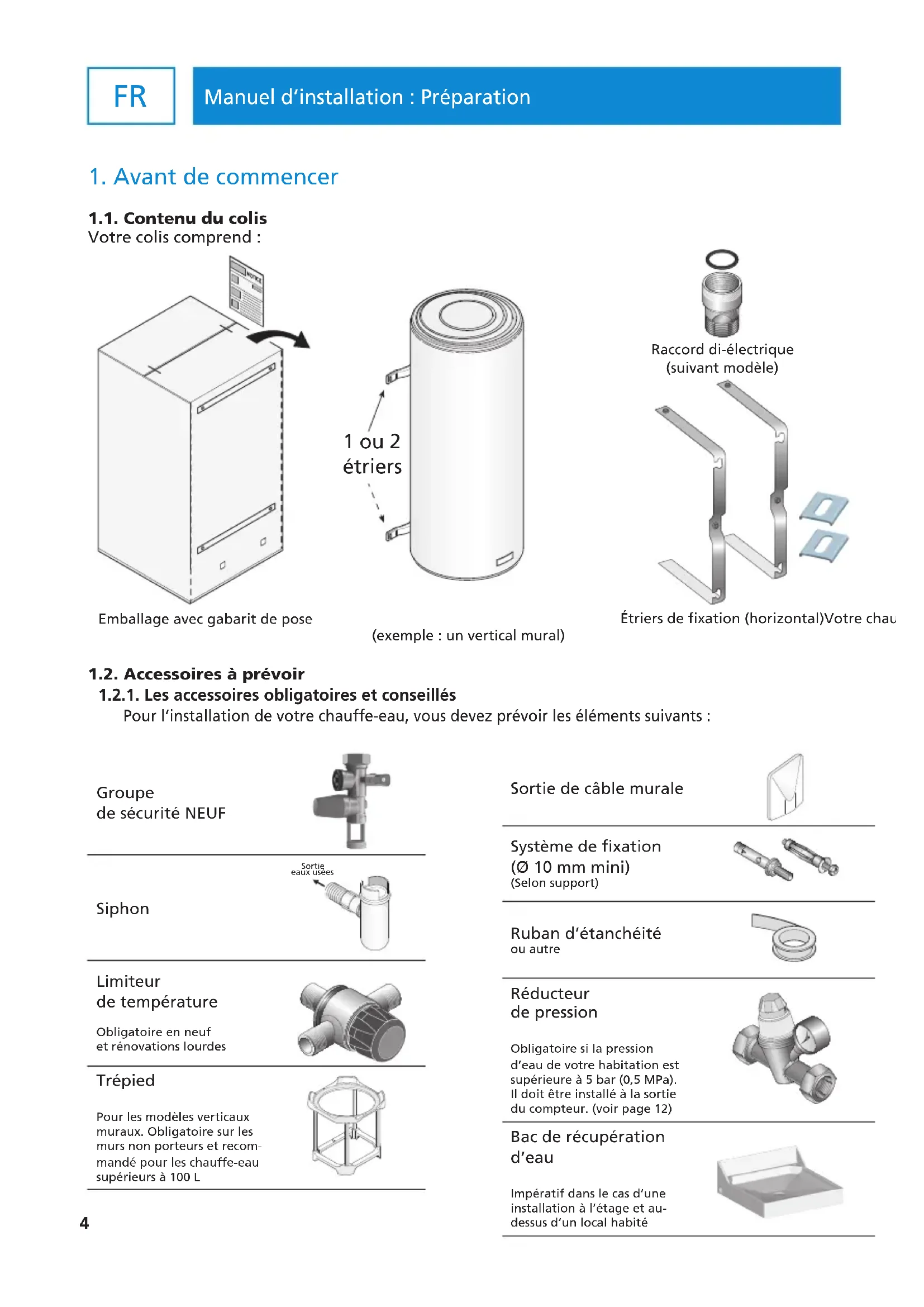 1.1. Contenu du colisVotre colis comprend :1.2. Accessoires à prévoir 1.2.1. Les accessoires obligatoires et conseillés Pour l’installation de votre chauffe-eau, vous devez prévoir les éléments suivants :Groupe de sécurité NEUFSiphonLimiteur de température Obligatoire en neuf et rénovations lourdesTrépied Pour les modèles verticaux muraux. Obligatoire sur les murs non porteurs et recom-mandé pour les chauffe-eau supérieurs à 100 L Emballage avec gabarit de pose Raccord di-électrique Kit de cerclage (selon modèle) 1 ou 2 étriers Votre chauffe-eau (exemple : un vertical mural) Emballage avec gabarit de poseRaccord di-électrique(suivant modèle)Étriers de xation (horizontal)Votre chauffe-eau(exemple : un vertical mural)Sortieeaux usées