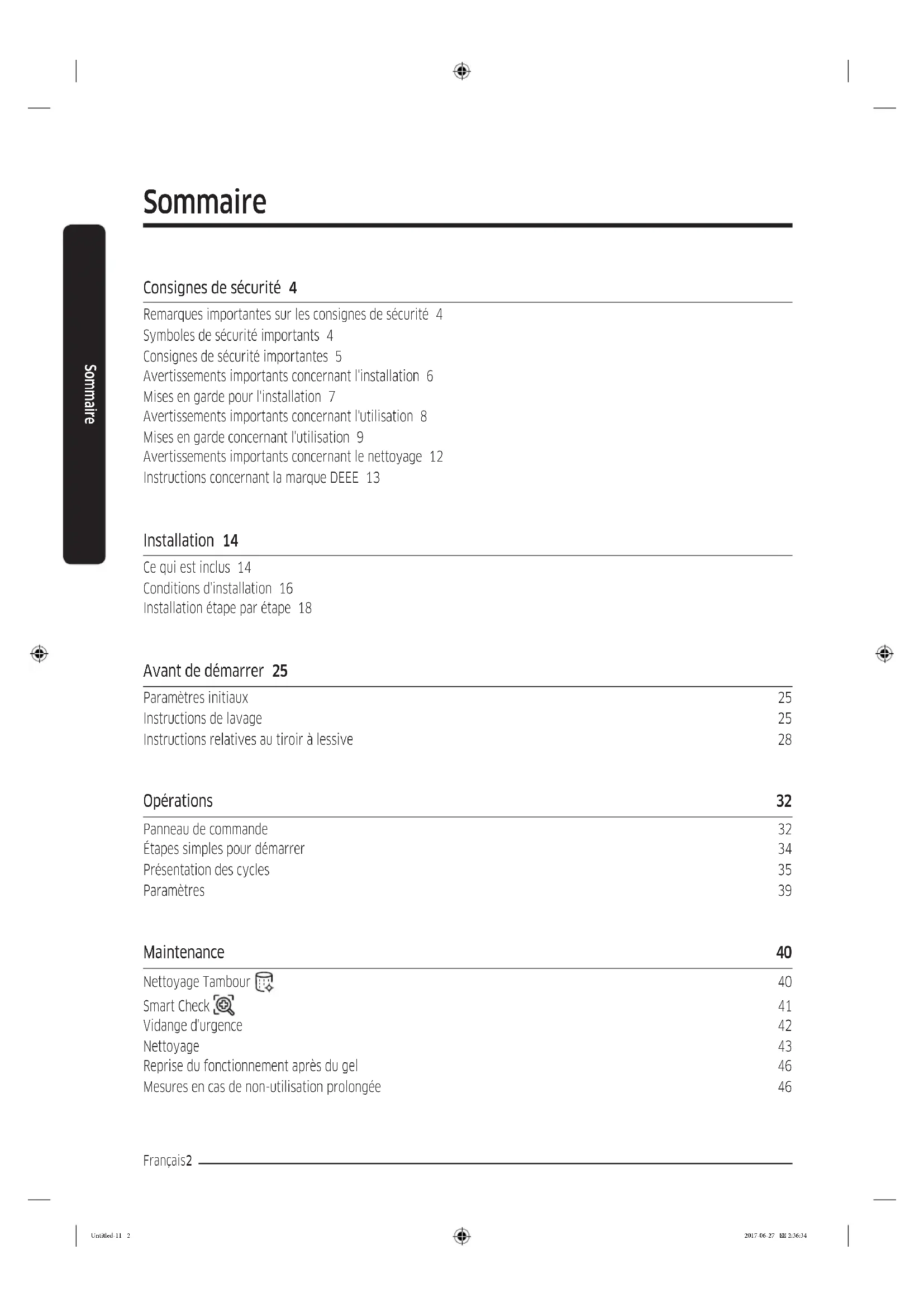 [HHP] 06196 9340224 www.samsung.com/de/support LUXEMBURG 261 03 710 www.samsung.com/be_fr/support DC68-03793F-01 Untitled-12 64 2017-06-27 2:38:55Lave-linge Manuel d'utilisation WW8*J5**5**/WW7*J5**5** Untitled-11 1 2017-06-27 2:36:33Français2 Sommaire Sommaire Consignes de sécurité 4 Remarques importantes sur les consignes de sécurité 4 Symboles de sécurité importants 4 Consignes de sécurité importantes 5 Avertissements importants concernant l'installation 6 Mises en garde pour l'installation 7 Avertissements importants concernant l'utilisation 8 Mises en garde concernant l'utilisation 9 Avertissements importants concernant le nettoyage 12 Instructions concernant la marque DEEE 13 Installation 14 Ce qui est inclus 14 Conditions d'installation 16 Installation étape par étape 18 Avant de démarrer 25 Paramètres initiaux 25 Instructions de lavage 25 Instructions relatives au tiroir à lessive 28 Opérations 32 Panneau de commande 32 Étapes simples pour démarrer 34 Présentation des cycles 35 Paramètres 39 Maintenance 40 Nettoyage Tambour 40 Smart Check