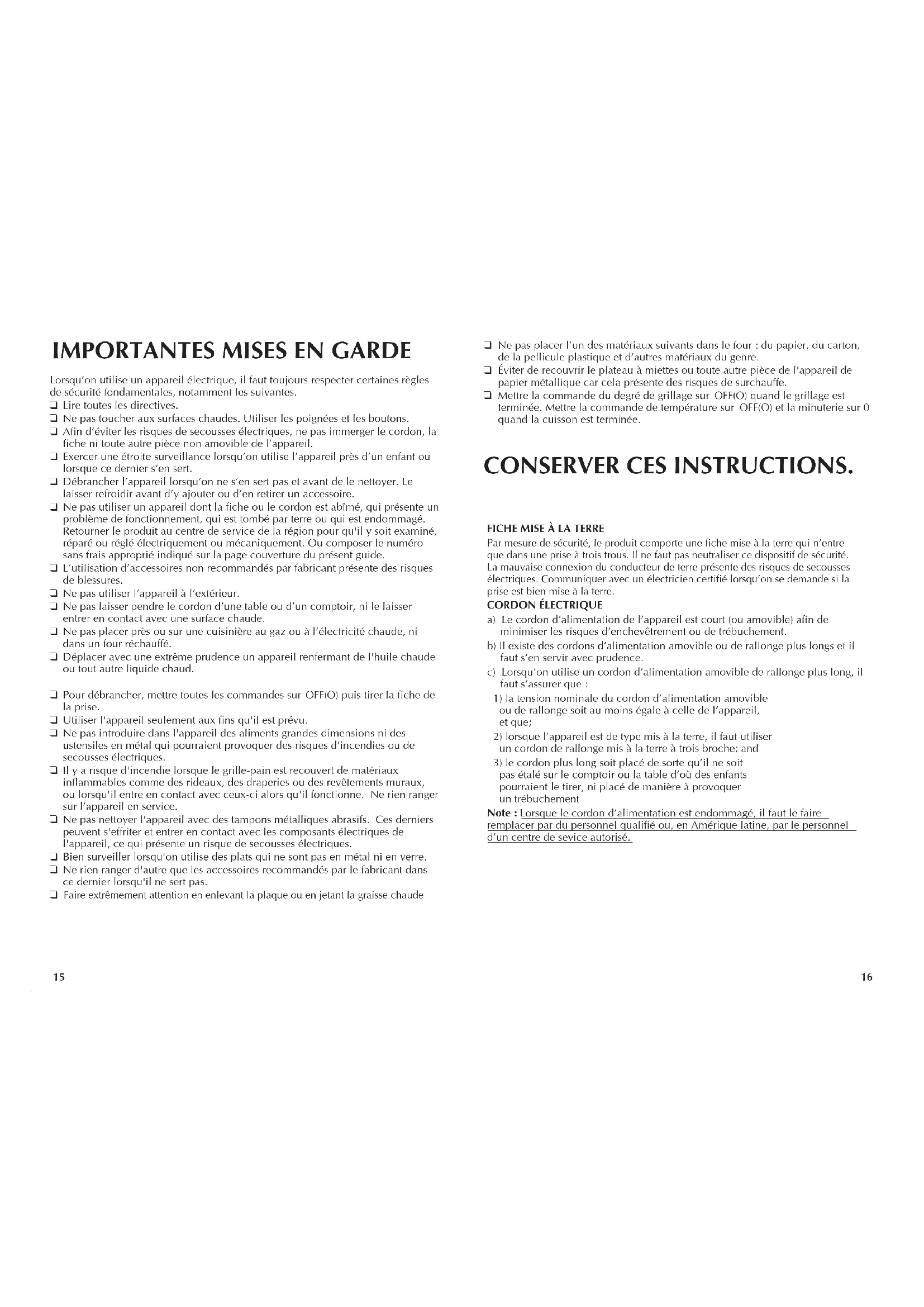 Ne rien ranger d'autre que les accessoires recommandés par le fabricant dans ce dernier lorsqu'il ne sert pas. ❑ Faire extrêmement attention en enlevant la plaque ou en jetant la graisse chaude