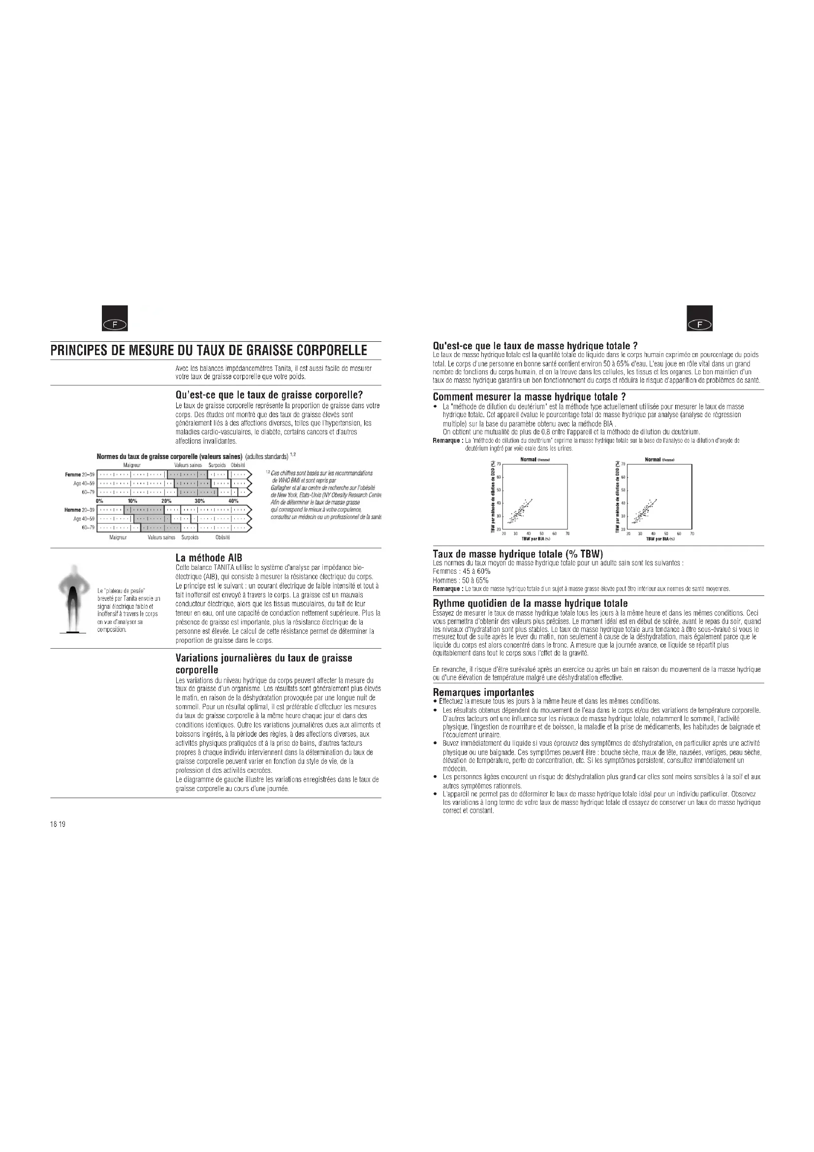- L'appareil ne permet pas de déterminer le taux de masse hydrique totale idéal pour un individu particulier. Observez les variations à long terme de votre taux de masse hydrique totale et essayez de conserver un taux de masse hydrique correct et constant.FF