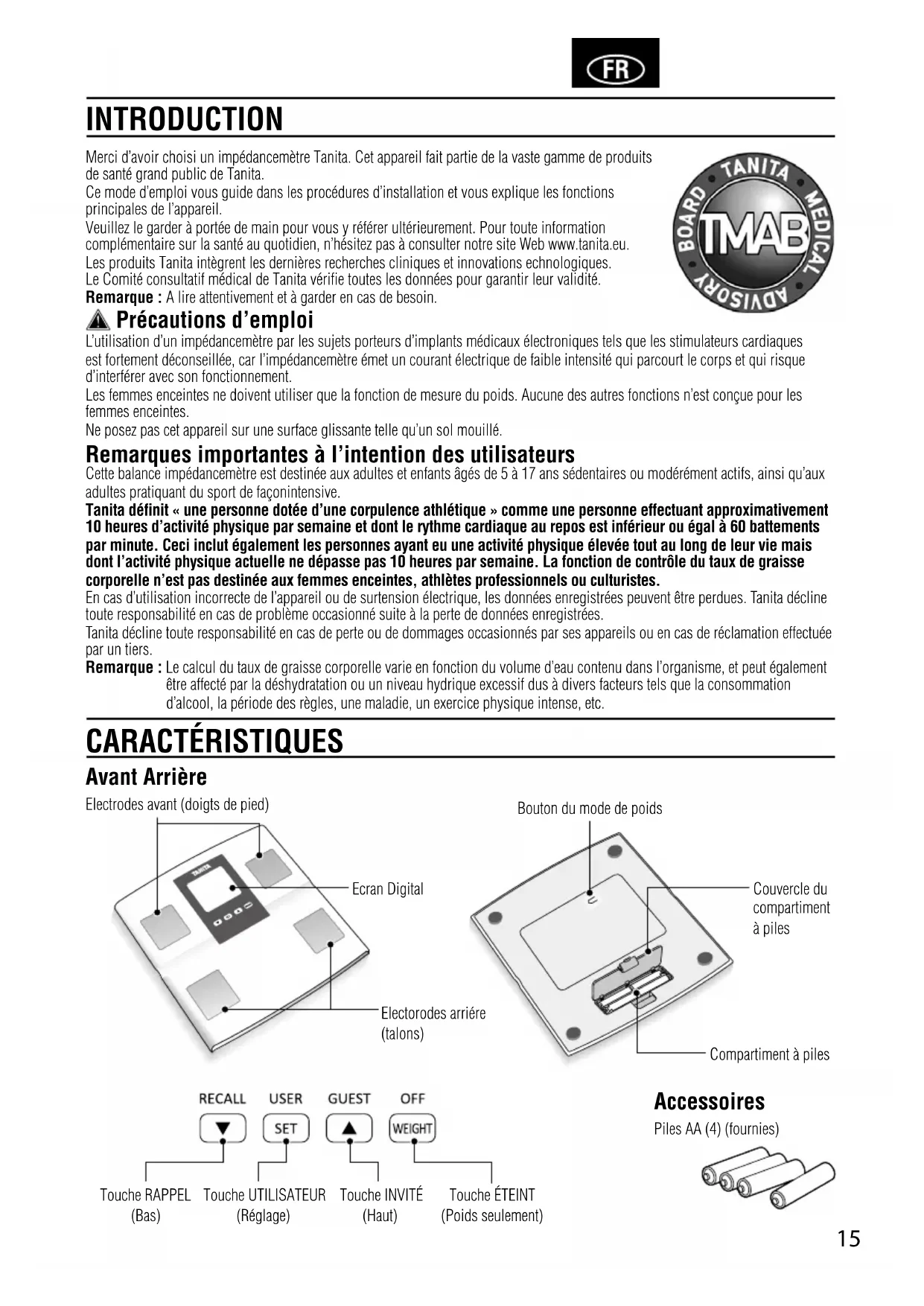 - BeimMessenwird„OL“angezeigt. Messungen lassen sich nur unter der maximalen Wiegekapazität durchführen. FEHLERSUCHE Spezifikation BC-541N Höchstgewicht 150kg(330lb)(23st8lb) Teilung 0.1kg(0.2lb)(0.2lb) Teilung der Körperfettanzeige 0.1% Persönliche Daten 5 Speicherplätze Stromversorgung 4 Mignonbatterien (enthalten) Stromverbrauch Maximal60mA Messstrom 50kHz,6.25kHz,100µA Batterien dürfen nicht in den Hausmull! AlsVerbrauchersindSiegesetzlichverpflichtet,gebrauchteoder ausgelaufene Batterien zuruckzugeben. Sie konnen Ihre alten Batterien bei den öffentlichen. Sammelstellen in Ihrer Stadt oder uberall dort abgeben, wo Batterien der betreffenden Art verkauft werden und speziell gekennzeichnete Sammelbehälter aufgestellt sind. Bei VerschrottungdesGerätessinddieBatterienzuentnehmenund müssen ebenfalls bei Sammelstellen abgegebenwerden. Hinweis: Diese Zeichen finden Sie auf schadstoffhaltigen Batterien: Pb Pb = Batterie enthält Blei, Cd Cd = Batterie enthält Cadmium, Hg Hg = Batterie enthält Quecksilber. Dieses Gerät ist funkentstört entsprechend der geltenden EG-Richtlinie2004/108/EC.15 Merci d’avoir choisi un impédancemètre Tanita. Cet appareil fait partie de la vaste gamme de produits de santé grand public de Tanita. Ce mode d’emploi vous guide dans les procédures d’installation et vous explique les fonctions principales de l’appareil. Veuillezlegarderàportéedemainpourvousyréférerultérieurement.Pourtouteinformation complémentaire sur la santé au quotidien, n’hésitez pas à consulter notre site Web www.tanita.eu. Les produits Tanita intègrent les dernières recherches cliniques et innovations echnologiques. Le Comité consultatif médical de Tanita vérifie toutes les données pour garantir leur validité. Remarque : A lire attentivement et à garder en cas de besoin. Précautions d’emploi L’utilisationd’unimpédancemètreparlessujetsporteursd’implantsmédicauxélectroniquestelsquelesstimulateurscardiaques est fortement déconseillée, car l’impédancemètre émet un courant électrique de faible intensité qui parcourt le corps et qui risque d’interférer avec son fonctionnement. Les femmes enceintes ne doivent utiliser que la fonction de mesure du poids. Aucune des autres fonctions n’est conçue pour les femmes enceintes. Ne posez pas cet appareil sur une surface glissante telle qu’un sol mouillé. Remarques importantes à l’intention des utilisateurs Cette balance impédancemètre est destinée aux adultes et enfants âgés de 5 à 17 ans sédentaires ou modérément actifs, ainsi qu’aux adultes pratiquant du sport de façonintensive. Tanita définit « une personne dotée d’une corpulence athlétique » comme une personne effectuant approximativement 10 heures d’activité physique par semaine et dont le rythme cardiaque au repos est inférieur ou égal à 60 battements par minute. Ceci inclut également les personnes ayant eu une activité physique élevée tout au long de leur vie mais dont l’activité physique actuelle ne dépasse pas 10 heures par semaine. La fonction de contrôle du taux de graisse corporelle n’est pas destinée aux femmes enceintes, athlètes professionnels ou culturistes. En cas d’utilisation incorrecte de l’appareil ou de surtension électrique, les données enregistrées peuvent être perdues. Tanita décline toute responsabilité en cas de problème occasionné suite à la perte de données enregistrées. Tanita décline toute responsabilité en cas de perte ou de dommages occasionnés par ses appareils ou en cas de réclamation effectuée par un tiers. Remarque : Le calcul du taux de graisse corporelle varie en fonction du volume d’eau contenu dans l’organisme, et peut également être affecté par la déshydratation ou un niveau hydrique excessif dus à divers facteurs tels que la consommation d’alcool, la période des règles, une maladie, un exercice physique intense, etc. INTRODUCTION CARACTÉRISTIQUES Avant Arrière Accessoires Piles AA (4) (fournies) Ecran Digital Bouton du mode de poids Couvercle du compartiment à piles Compartiment à piles Electrodes avant (doigts de pied) Electorodes arriére (talons) Touche RAPPEL (Bas) Touche UTILISATEUR (Réglage) ToucheINVITÉ (Haut) ToucheÉTEINT (Poids seulement)16 Pour que les résultats soient aussi exacts que possible, les mesures doivent être effectuées sans vêtements et dans des conditions hydriques similaires. Si vous n’ôtez pas vos vêtements, ôtez vos collants ou chaussettes et assurez-vous que vos pieds sont propres et secs avant de monter sur la balance. Assurez-vous que vos talons sont correctement alignés avec les électrodes du plateau de pesée. Ne vous inquiétez pas si le plateau semble trop court pour vos pieds. L’appareil fonctionne correctement même lorsque vos orteils dépassent du plateau.Il est préférable d’effectuerlesmesuresàlamêmeheuredelajournéeetdansdesconditions identiques pour obtenir des résultats homogènes. Essayez si possible d’effectuer la mesureaumoins3heuresaprèslelever,unrepasouunexercicephysiqueviolent. Remarque : les mesures ne sont valides que si vos pieds sont propres et secs, que vos genoux ne sont pas pliés et que vous n’êtes pas assis. Talons centrés sur les électrodes. Les orteils peuvent dépasser du plateau. Conseils de manipulation Cet appareil est un instrument de précision faisant appel à des technologies de pointe. Pour maintenir l’appareil dans des conditions optimales d’utilisation, suivez les indications suivantes :