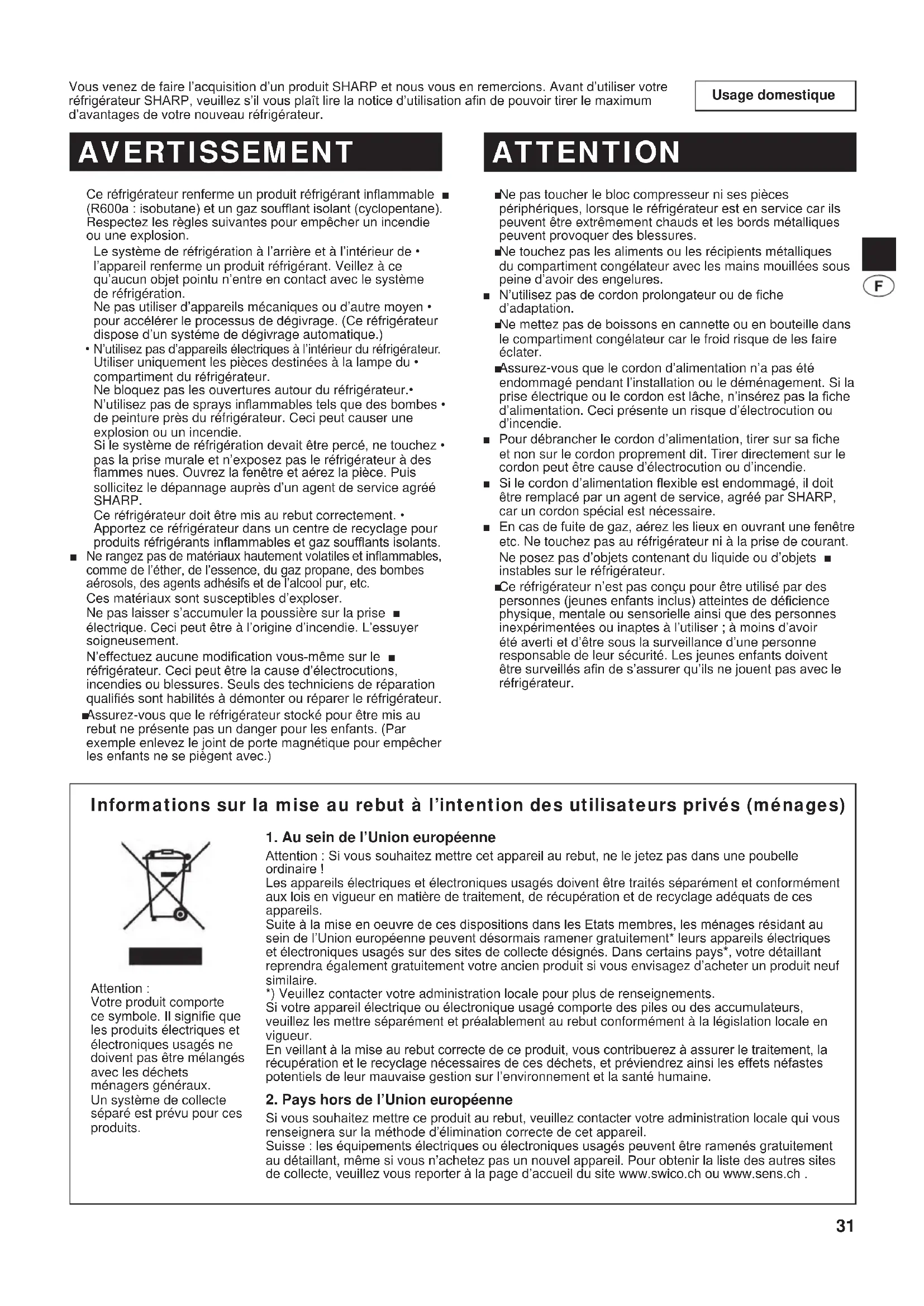 ENTRATA USCITA La refrigerazione riduce la velocità di deperimento dei cibi. Per massimizzare la durata di conservazione dei prodotti alimentari deperibili, assicuratevi che il cibo sia della qualità più fresca possibile. La seguente guida generale é per consentire una piú lunga conservazione dei cibi. Frutta / Verdura Per minimizzare le perdite di umidità, frutta e verdura devono essere leggermente avvolte in materiali plastici quali, ad esempio, pellicole o sacchetti (da non chiudere ermeticamente) e quindi inseriti nella vasca per verdura fresca. Latticini e uova Molti prodotti derivati dal latte hanno la scadenza di consumo • indicata sulla confezione esterna, la quale illustra sia la temperatura consigliata che la durata di conservazione del prodotto.Le uova devono essere riposte nel portauova.• Carne / Pesce / Pollame Mettete su un piatto e coprite con carta o con pellicola in • plastica.Riponete le fette grandi di carne, di pesce o di pollame in • fondo alle mensole. Assicuratevi che tutti i cibi cotti siano accuratamente avvolti • oppure che siano posti in contenitori a chiusura ermetica. NOTA Disponete gli alimenti sui ripiani • omogeneamente per consentire che l’aria di raffreddamento possa circolare in modo efciente.Alimenti caldi devono essere fatti • raffreddare prima di essere riposti nel frigorifero. Gli alimenti caldi aumentano infatti la temperatura interna e potrebbero far deperire altri alimenti ivi conservati.Non otturate l’entrata e l’uscita • del circuito di circolazione dell’aria fredda con alimenti o con contenitori; altrimenti, gli alimenti potrebbero non venire raffreddati bene.Tenere la porta debitamente • chiusa.Non riponete alimenti direttamente all’uscita dell’aria fredda, in quanto l’alimento si potrebbe congelare. Per un migliore congelamento I cibi devono essere freschi.• Congelate piccole quantitá di cibo per volta al ne di • congelarle rapidamente.I cibi deve essere sigillati, chiusi ermeticamente o coperti • appropriatamente. Disponete i cibi omogeneamente nel freezer.• Etichettate le buste o i contenitori per tenere un inventario dei • cibi congelati. (B245)-W.indb 29 2011/08/30 20:41:4030 PRIMA DI CHIAMARE IL SERVIZIO DI ASSISTENZA Prima di chiamare il servizio di assistenza controllate i seguenti punti. Problema Soluzione La parte esterna del frigorifero risulta calda quando viene toccata. Questo è normale. Nei frigoriferi è situato un tubo caldo per prevenire la formazione di condensa. Il frigorifero emette rumore. É normale che il frigorifero produca i seguenti rumori. Forte rumore prodotto dal compressore quando sta avviandosi a funzionare. Il rumore si • attenua dopo un momento. Forte rumore prodotto una volta al giorno dal compressore. Rumore prodotto • immediatamente dopo l’operazione automatica di disgelamento. Rumore della circolazione del uido (rumore di gorgoqlio e rumore di liquido che “frizza”) • --- Rumore del refrigerante che ricircola nelle tubazioni. Rumore di scricchiolio, squittio --- Rumore prodotto dall’espansione e contrazione delle • pareti interne e delle parti interne durante il congelamento. Si forma della condensa o del ghiaccio sulle parti interne o esterne del frigorifero. Ciò può vericarsi in uno dei seguenti casi. Utilizzare un panno umido per rimuovere il ghiaccio e un panno asciutto per rimuovere la condensa. Quando l’umidità dell’ambiente è elevata.• Quando la porta viene aperta e chiusa spesso.• Quando vengono conservati prodotti alimentari molto umidi. (È necessario un involucro).• I prodotti alimentari nel comparto frigorifero si congelano. Il frigorifero funziona per lungo tempo con controllo temp. frigorifero impostato su 0 °C?• Il frigorifero funziona per lungo tempo con controllo temp. freezer impostato su -21 °C?• Una bassa temperatura della stanza può causare il congelamento dei cibi conservati anche • se il controllo temp. frigorifero é impostato a 6 °C. Nel comparto c’è un odore sgradevole. È necessario un involucro per i prodotti alimentari con un odore forte.• L’unità di deodorizzazione non è in grado di rimuovere tutti i cattivi odori.• Il pannello di controllo LCD a soramento non funziona. Ciò può vericarsi in uno dei seguenti casi. Il pannello o il dito sono bagnati o sporchi di olio, ecc.• Si sora il pannello indossando un guanto o un cerotto sul dito, oppure usando l’unghia o • altri oggetti. Vi è un adesivo o un nastro attaccato sui simboli.• La posizione di soramento è leggermente distante dai simboli.• Il tempo di azionamento non è sufciente per attivare i simboli.• SE É ANCORA NECESSARIO IL SERVIZIO DI ASSISTENZA Rivolgetevi al più vicino centro di assistenza approvato da SHARP. (B245)-W.indb 30 2011/08/30 20:41:4031 Usage domestique Vous venez de faire l’acquisition d’un produit SHARP et nous vous en remercions. Avant d’utiliser votre réfrigérateur SHARP, veuillez s’il vous plaît lire la notice d’utilisation an de pouvoir tirer le maximum d’avantages de votre nouveau réfrigérateur. Ce réfrigérateur renferme un produit réfrigérant inammable ■ (R600a : isobutane) et un gaz soufant isolant (cyclopentane). Respectez les règles suivantes pour empêcher un incendie ou une explosion. Le système de réfrigération à l’arrière et à l’intérieur de • l’appareil renferme un produit réfrigérant. Veillez à ce qu’aucun objet pointu n’entre en contact avec le système de réfrigération. Ne pas utiliser d’appareils mécaniques ou d’autre moyen • pour accélérer le processus de dégivrage. (Ce réfrigérateur dispose d’un systéme de dégivrage automatique.) N’utilisez pas d’appareils électriques à l’intérieur du réfrigérateur.• Utiliser uniquement les pièces destinées à la lampe du • compartiment du réfrigérateur. Ne bloquez pas les ouvertures autour du réfrigérateur.• N’utilisez pas de sprays inammables tels 