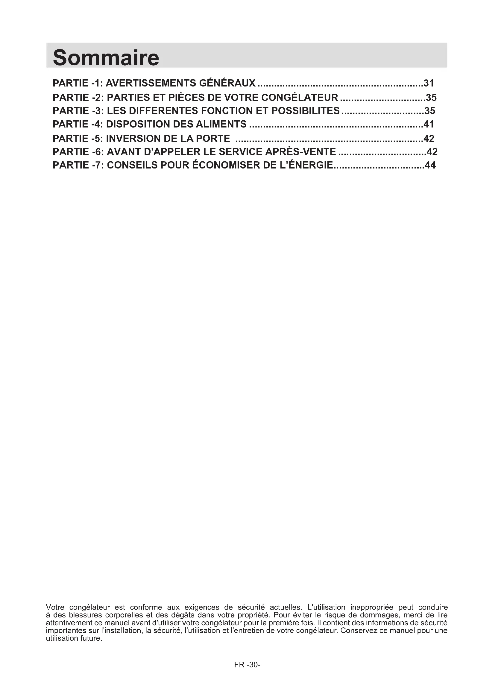Votre congélateur est conforme aux exigences de sécurité actuelles. L'utilisation inappropriée peut conduire à des blessures corporelles et des dégâts dans votre propriété. Pour éviter le risque de dommages, merci de lire attentivement ce manuel avant d'utiliser votre congélateur pour la première fois. Il contient des informations de sécurité importantes sur l'installation, la sécurité, l'utilisation et l'entretien de votre congélateur. Conservez ce manuel pour une utilisation future. Sommaire