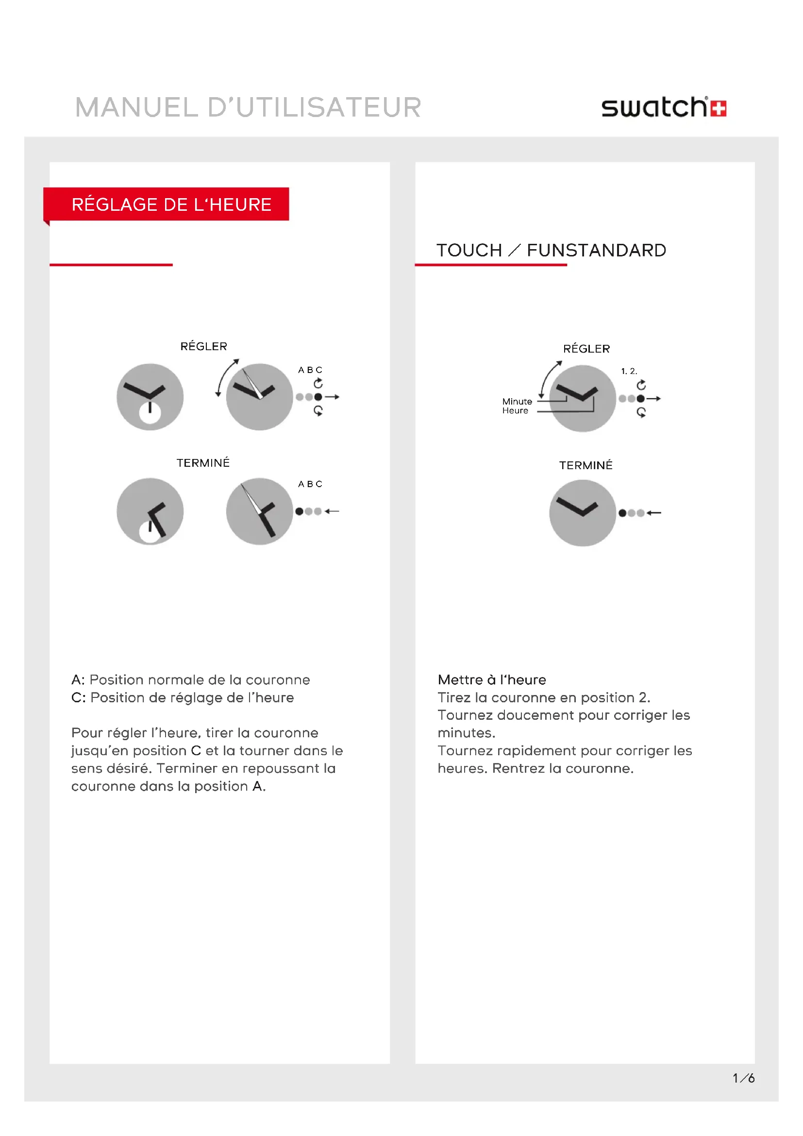 2/6 TOUCH / FUN RÉGLAGE STANDARD RÉGLAGE DU JOUR / DE LA DATE Pour régler la date, tirer la couronne jusqu’en position B et la tourner dans le sens anti-horaire. Puis dans le sens horaire pour régler le jour. Terminer en repoussant la couronne dans la position A.